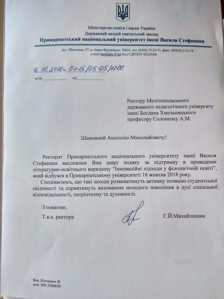 Ректорові МДПУ імені Богдана Хмельницького було передано подяку від адміністрації ПНУ ім. В. Стефаника за підтримку в проведенні заходу, який розвиватиме активну позицію студентської свідомості та сприятиме вихованню молодого покоління в дусі соціальної відповідальності, патріотизму та духовності.