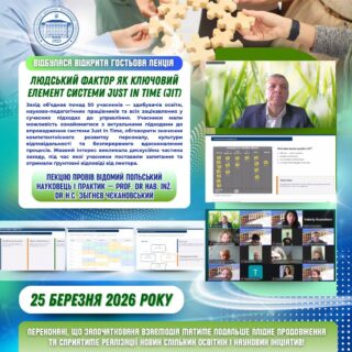 ⚙️👥 Лекцію на тему «Людський фактор як ключовий елемент системи Just in Time (JIT)» провів відомий польський науковець і практик — prof. dr hab. inż. dr h.c. Збігнєв Чєкановський. У центрі уваги були питання ролі людини в забезпеченні ефективності виробничих систем, механізми організації потоків, стандартизації роботи та формування управлінського лідерства.