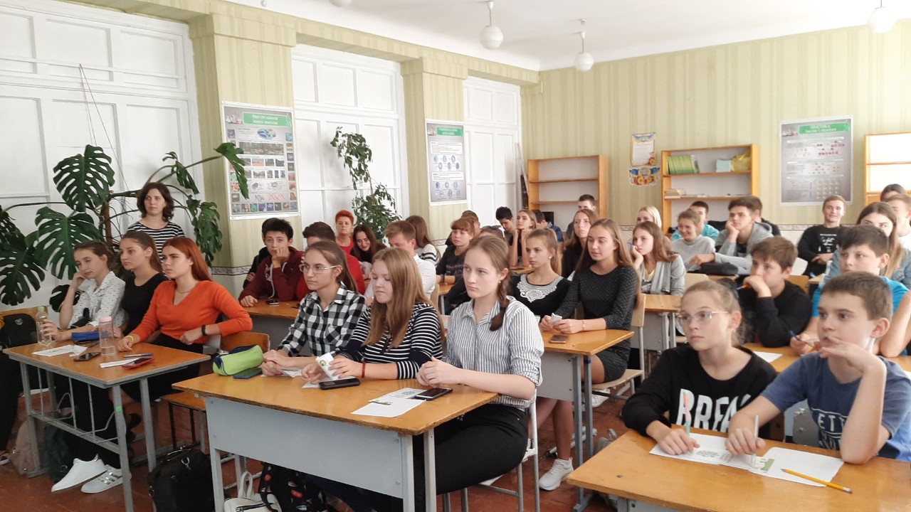 Студентка розповіла про основні правила роздільного сортування та класифікацію видів вторинної сировини, про маркування пластику трикутником (від 1 до 7), провела тест на визначення екологічної свідомості школярів та показала соціальний ролик про сортування сміття.