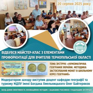 📚🧑🏻🎓 Під час майстер-класу було презентовано авторську методику застосування пам’ятних і ювілейних монет України в шкільному курсі географії 8 класу.