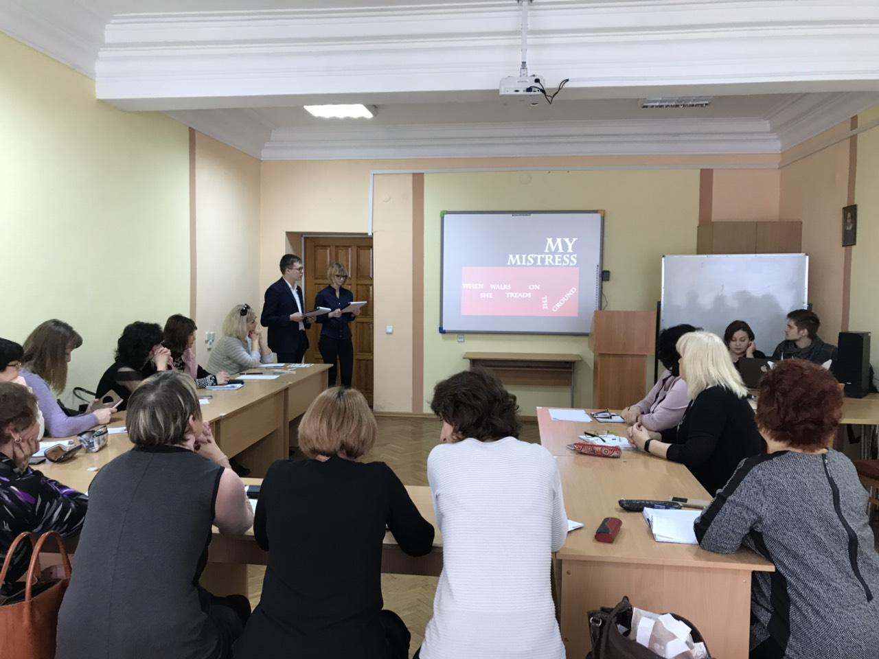 Майстер-клас проводився в рамках інтеграції предметних областей: Література, Англійська мова, Психологія, Театр. Учителі поринули у світ творів У.Шекспіра, мали змогу удосконалити свої знання, розширили методи поділу класу на групи. Захід проводився в інтерактивному режимі. Застосування інтерактивних технологій, як відомо, є одним із способів підвищення ефективності сучасного уроку.