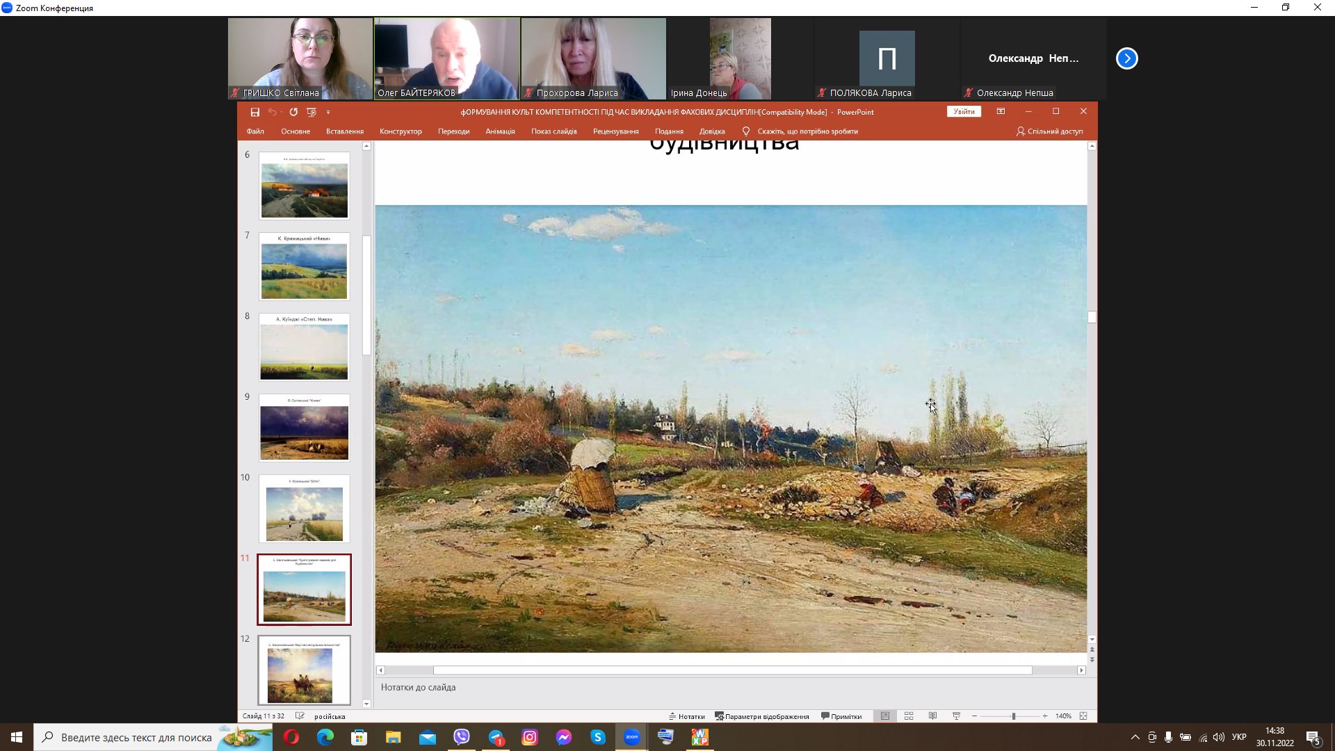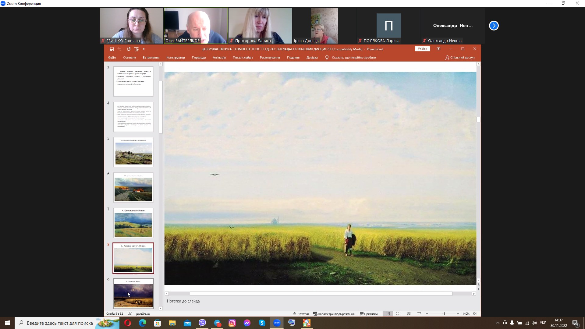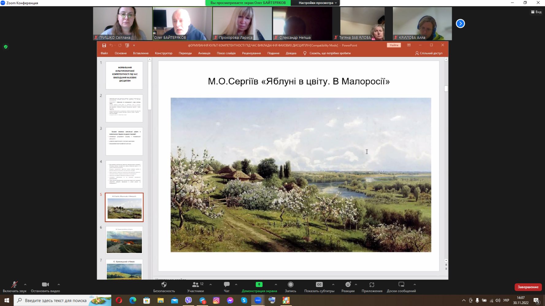 Під час майстер-класу Байтеряков О.З. зупинився на значенні культурологічної компетентності для майбутнього вчителя, визначив доцільність і методичні особливості застосування творів художньої літератури та живопису під час вивчення фахових дисциплін. Поділився досвідом і власною методикою застосування творів живопису в географічній освіті для формування ключових компетентностей у здобувачів вищої освіти.