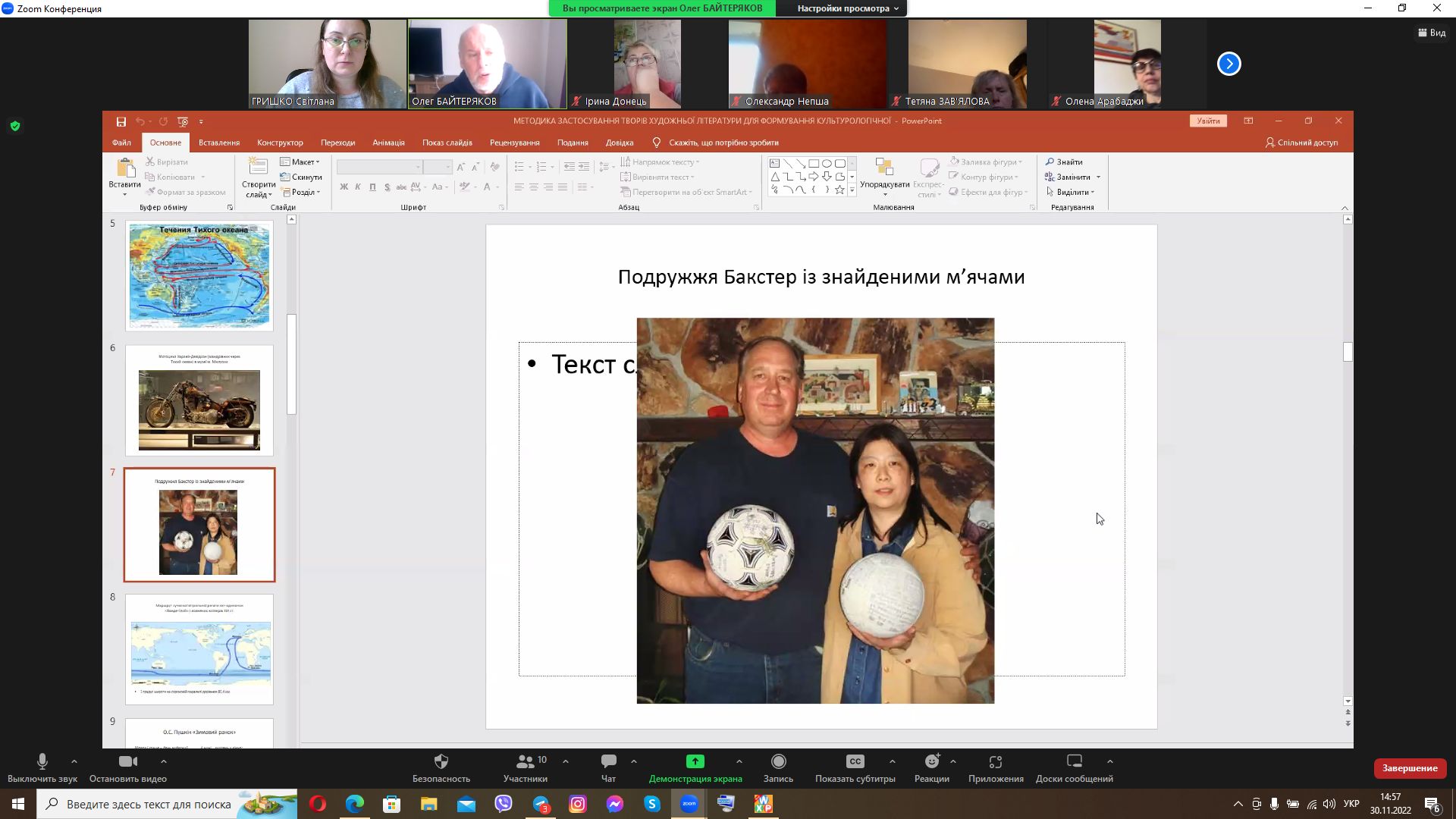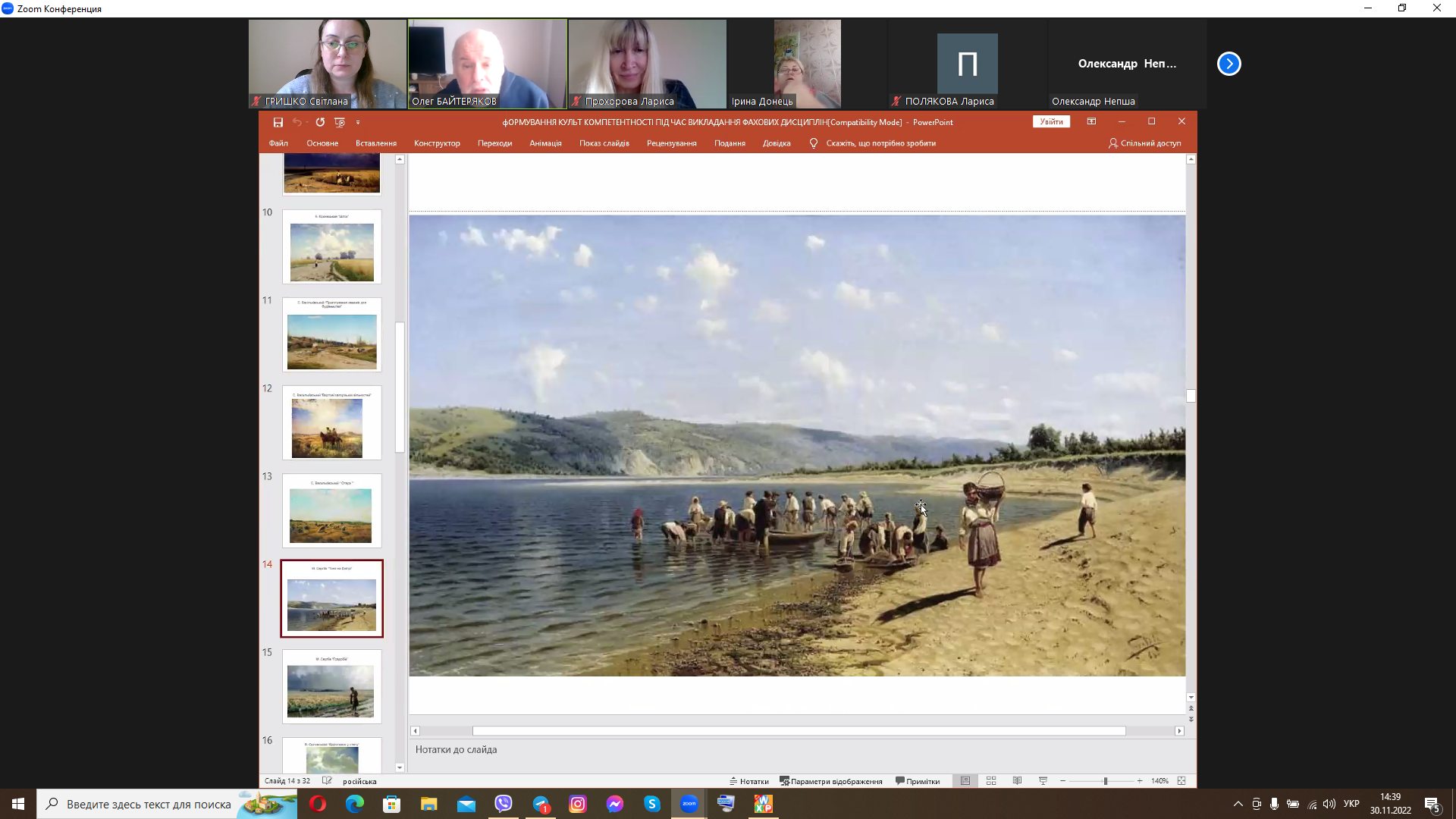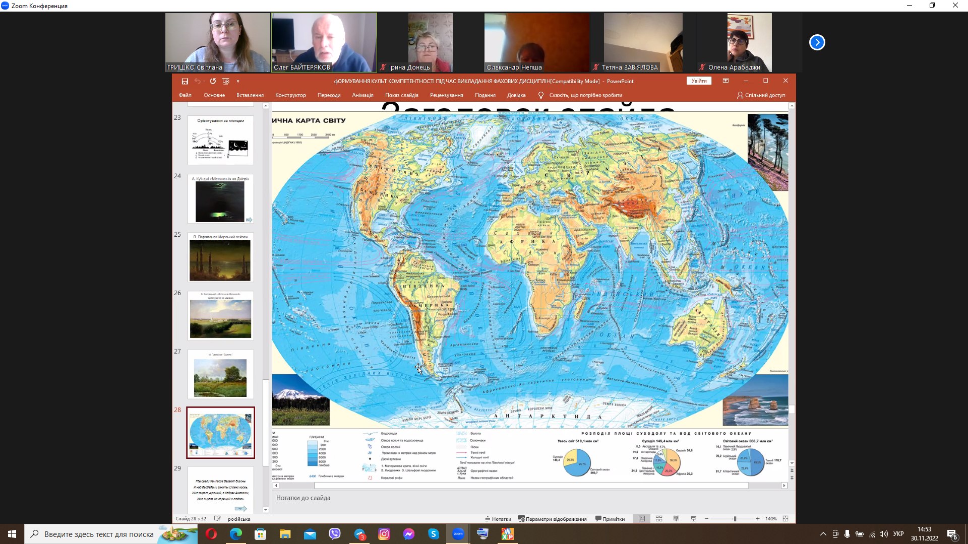Під час майстер-класу Байтеряков О.З. зупинився на значенні культурологічної компетентності для майбутнього вчителя, визначив доцільність і методичні особливості застосування творів художньої літератури та живопису під час вивчення фахових дисциплін. Поділився досвідом і власною методикою застосування творів живопису в географічній освіті для формування ключових компетентностей у здобувачів вищої освіти.