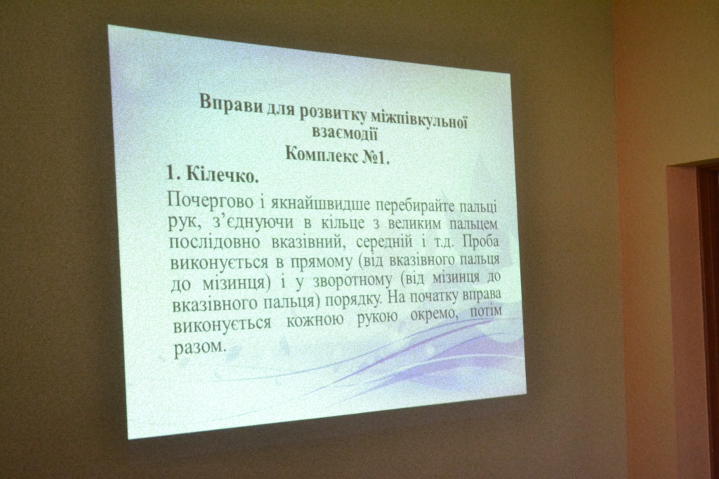 На заході було практично апробовано кінезіологічні вправи на узгодження роботи правої і лівої півкулі головного мозку («Кілечко», «Кулак-ребро-долоня», «Дзеркальне малювання», «Вухо-ніс»), що допомагають покращити пам’ять у дітей з ФФН та ЗНМ. Також цікавими виявилися кінезіологічні вправи на розвиток абстрактного мислення (було продемонстровано два комплекси) для дітей із ЗПР, ДЦП та дизартрією.