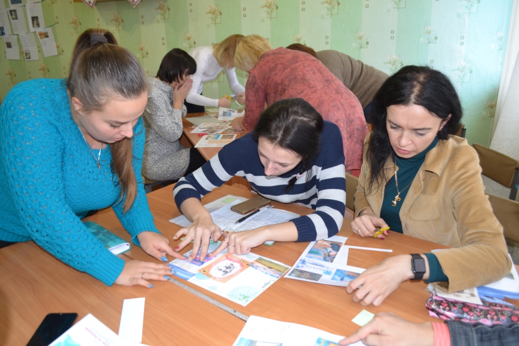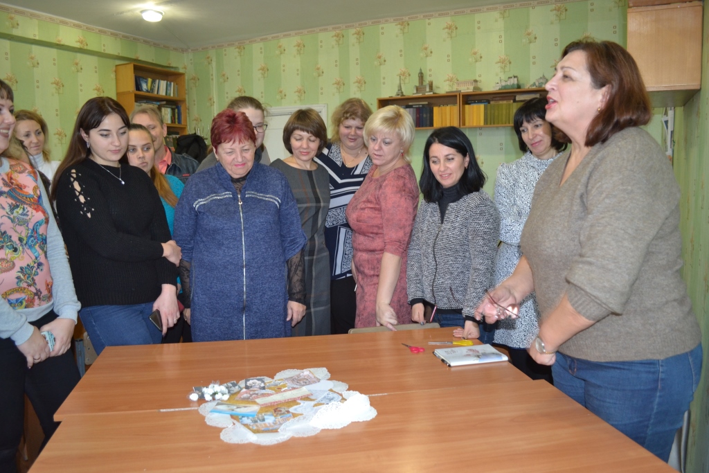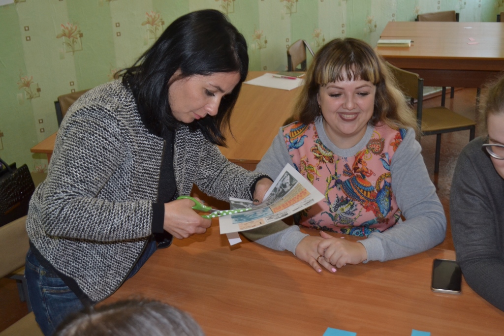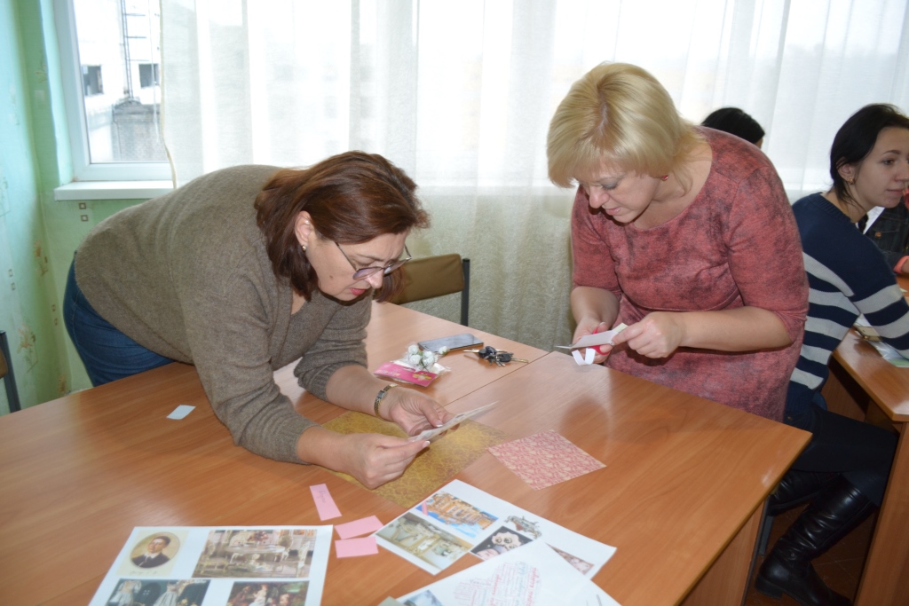 Доцент Землянська А.В. ознайомила присутніх з технологіями скрапбукінгу та кардмейкінгу, зі скрап-проєктами та методикою їх використання на уроках української і зарубіжної літератури, основними видами навчальних і творчих завдань, які виконуються студентами Мелітопольського державного педагогічного університету імені Богдана Хмельницького на заняттях із зарубіжної літератури, та запропонувала перевірити свої знання та креативні здібності через створення проєкту-картки за певними літературними напрямами і течіями (бароко, футуризму, імпресіонізму та ін.). Унаслідок мозкового штурму учасники майстер-класу успішно виконали завдання: дуже креативно підійшли до оформлення і змістового наповнення листівок, проявили свої навички групової роботи та критичного аналізу робіт інших команд.