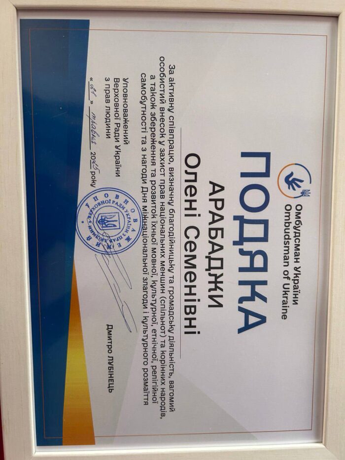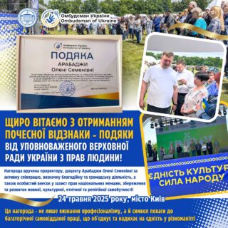 ⭐️👩🏼🎓ОЛЕНА СЕМЕНІВНА АРАБАДЖИ, проректор з науково-педагогічної роботи, зовнішніх зв’язків і стратегічного розвитку Мелітопольського державного педагогічного університету імені Богдана Хмельницького, отримала ПОДЯКУ від Уповноваженого Верховної Ради України з прав людини. Нагорода вручена за активну співпрацю, визначну благодійну та громадську діяльність, а також особистий внесок у захист прав національних меншин, збереження та розвиток мовної, культурної, етнічної та релігійної самобутності.