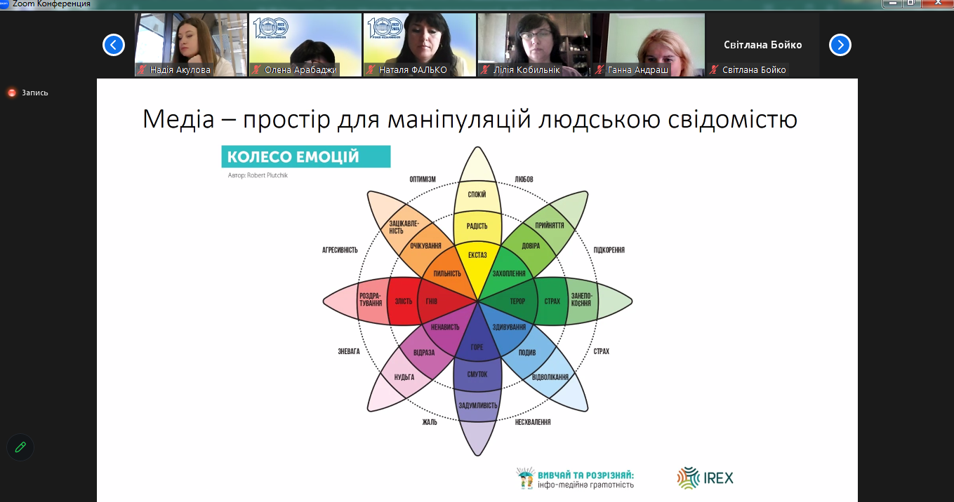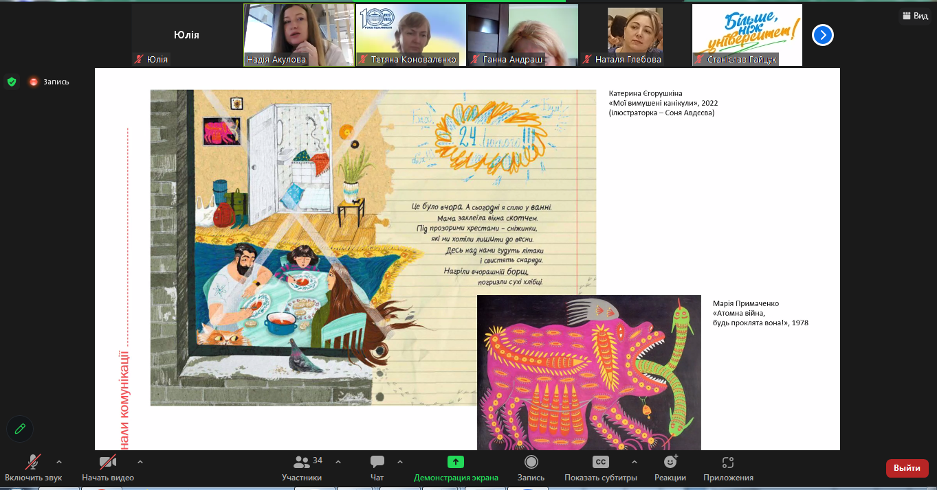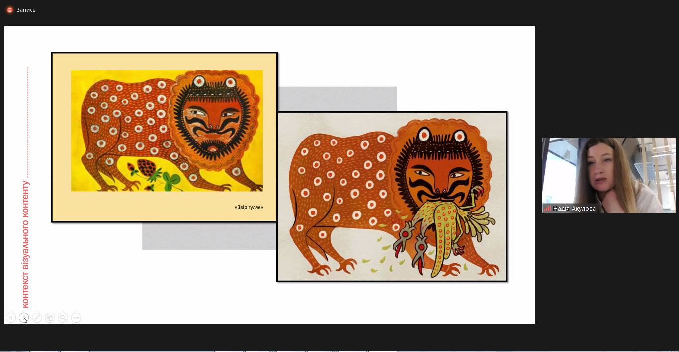 Кандидат філологічних наук, доцент Надія Акулова запропонувала учасникам вебінару зосередитись на проблемі візуальної грамотності, що є важливою складовою системи медіаосвіти в цілому. Через призму поняття “графічна дезінформація” було розглянуто візуальні практики українського повсякдення, які реалізуються в умовах інформаційної війни, що триває.