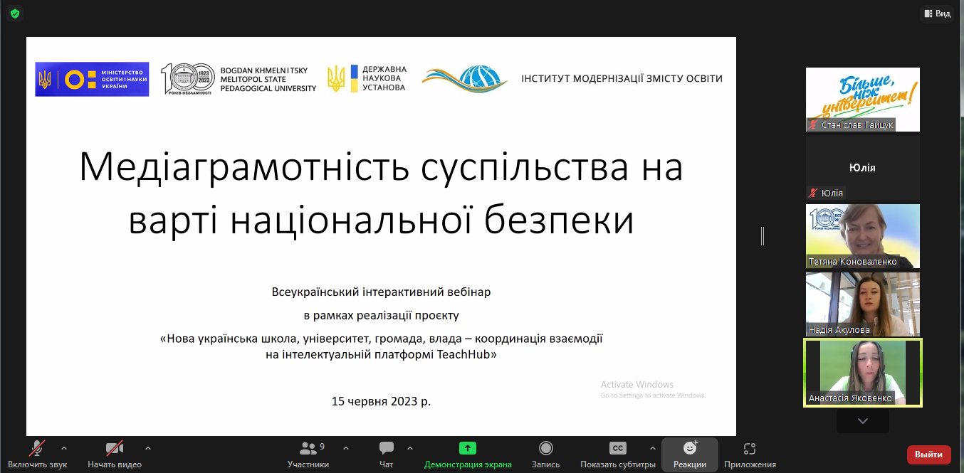 15 червня 2023 р. відбувся Всеукраїнський інтерактивний вебінар «Медіаграмотність суспільства на варті національної безпеки» в рамках реалізації ІІ (концептуально-діагностичного) етапу інноваційного освітнього проєкту «Нова українська школа, університет, громада, влада – координація взаємодії на інтелектуальній платформі TeachHub» (наказ МОН України від 29.09.2021 № 1041). Захід було організовано викладачами Мелітопольського державного педагогічного університету імені Богдана Хмельницького за інформаційної підтримки Наукової установи «Інститут модернізації змісту  освіти».