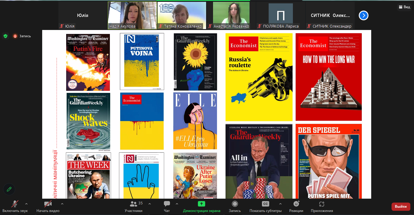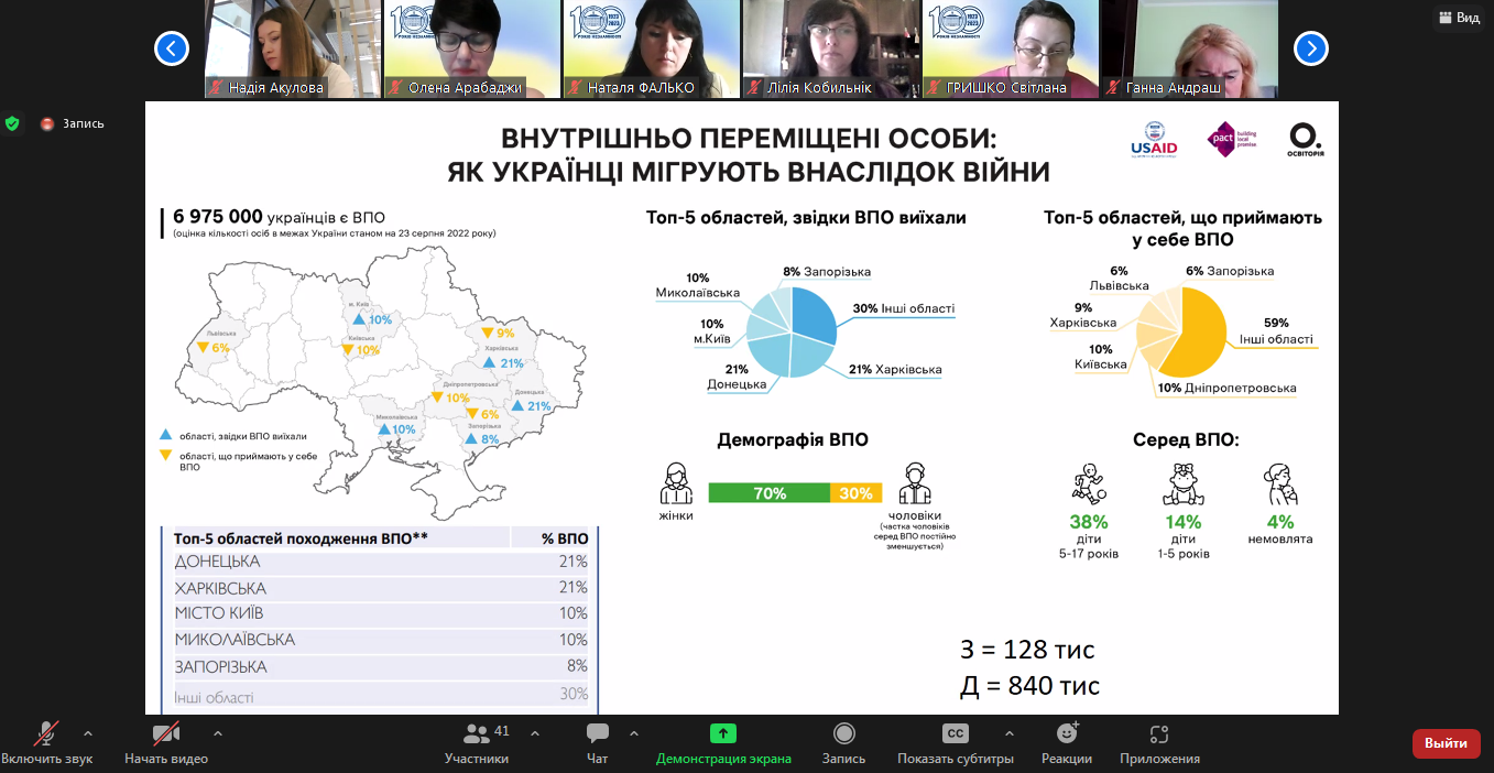Кандидат фізико-математичних наук, старший викладач Анастасія Яковенко продемонструвала учасникам вебінару, як слід аналізувати статтю з мережі Інтернет стосовно числових відомостей про кількість українських біженців. Учасники разом зі спікером порівняли представлену в мас-медіа інформацію з даними державної статистичної служби України, міжнародної організації USAID та порталу оперативних даних (ODP) від ООН. У результаті аналізу було виявлено маніпуляції зі статистичними даними, за допомогою яких рф намагається переконати світ у своїй гуманності. Також доповідачкою було висвітлено проблему неякісного оформлення графічного представлення данних про міграцію чоловічого населення за кордон, яка призвела до маніпулятивних та провокативних статей в медійному просторі України.