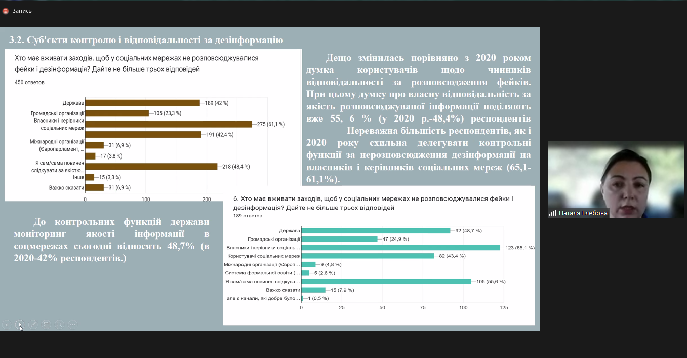 Доктор соціологічних наук, професор Наталя Глебова поділилася результатами соціологічного дослідження рівня розвиненості інфомедійної грамотності населення «Моя навігація в інфомедійному просторі», яке вперше проводилося в грудні 2020 року – січні 2021 року на замовлення «Хабу інфомедійної грамотності громадян», і вдруге – в червні 2023 року упродовж двох тижнів перед вебінаром. Отримані результати засвідчили суттєве зростання інтересу до інформації в молодіжному сегменті користувачів, активність користувачів у протидії розповсюдження недостовірної інформації, а також значну довіру офіційним джерелам, інформаційним платформам та незалежним аналітичним програмам, виконавці яких відповідально ставляться до своєї місії в умовах війни. Отримані дані дають змогу зробити висновки і внести корективи для більш ефективного і надійного використання інформаційних платформ та вироблення стратегії підвищення рівня інформаційної і медійної освіченості населення в умовах війни та поствоєнного відновлення. Так, особливої уваги потребує підготовка науково-освітніх і культурно-інформаційних платформ до якісного й ефективного супроводу вирішення складних соціально-культурних проблем після повної деокупації.