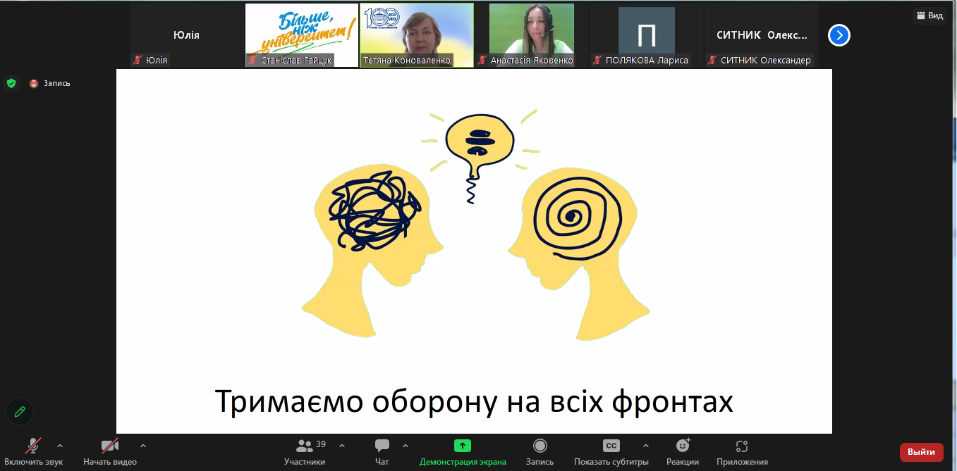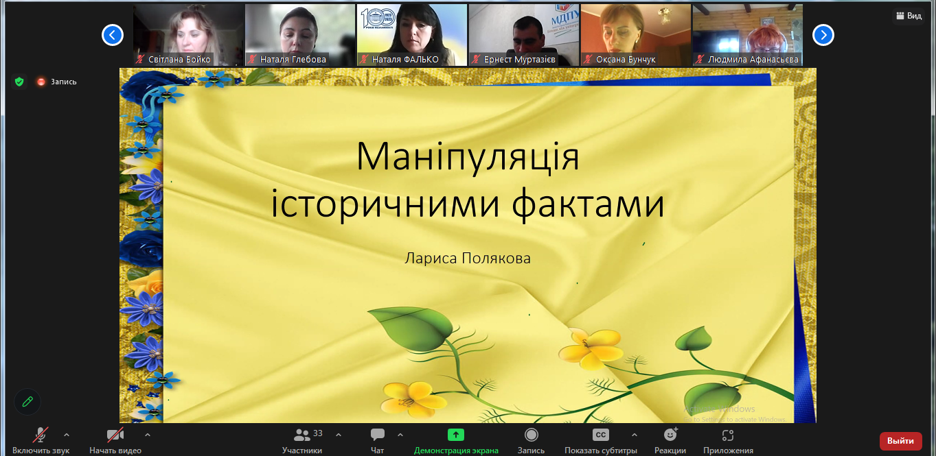 Кандидат історичних наук, доцент Лариса Полякова розкрила питання маніпуляції історичними фактами з боку країни-агресорки, використовувані нею з метою нівеляції ролі державотворчих процесів в Україні, маніпуляції свідомістю громадян, знищення української національної ідентичності. Учасники вебінару дізналися важливу інформацію про походження Русі і співвіднесли її з хронологією походження Московії, яку намагаються переписувати російські псевдо-історики.