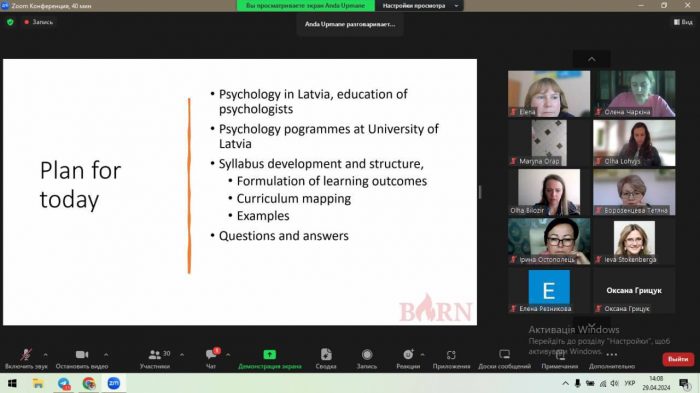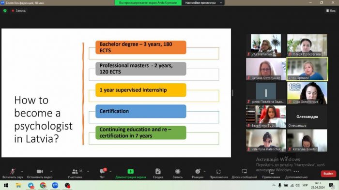 Слухачі вебінару отримали детальну інформацію щодо психологічної освіти в Латвії, програм з психології в Латвійському університеті, ознайомилися з особливостями розробки і структури освітньої програми, формулювання результатів навчання і картування навчальної програми.