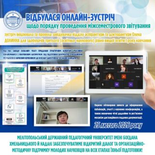 📅 25 лютого 2026 року відбулася онлайн-зустріч завідувачки відділу аспірантури та докторантури Олени ДОЛИННОЇ зі здобувачами третього (освітньо-наукового) рівня вищої освіти І року навчання. Основною темою обговорення став порядок проведення міжсеместрового звітування.