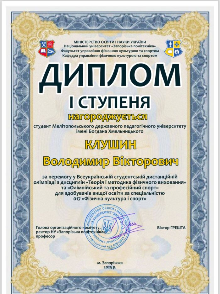🥇🥳 Клушин Володимир Вікторович — студент факультету фізичної культури, спорту та психології — виборов Диплом І ступеня у Всеукраїнській студентській дистанційній олімпіаді з дисциплін