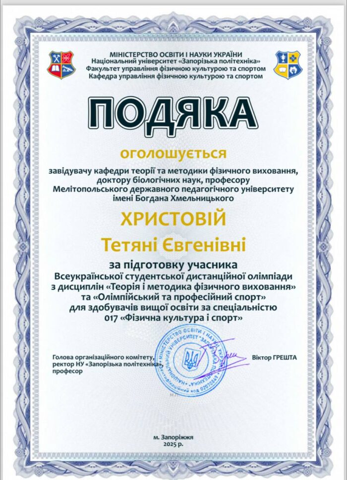 👏🏻🇺🇦Окрема шана та глибока вдячність науковому керівнику — Христовій Тетяні Євгенівні, доктору біологічних наук, професору, завідувачці кафедри теорії та методики фізичного виховання. Саме завдяки її високій компетентності, вірі в кожного студента та невтомній праці було закладено фундамент успіху, який сьогодні прославляє наш університет!