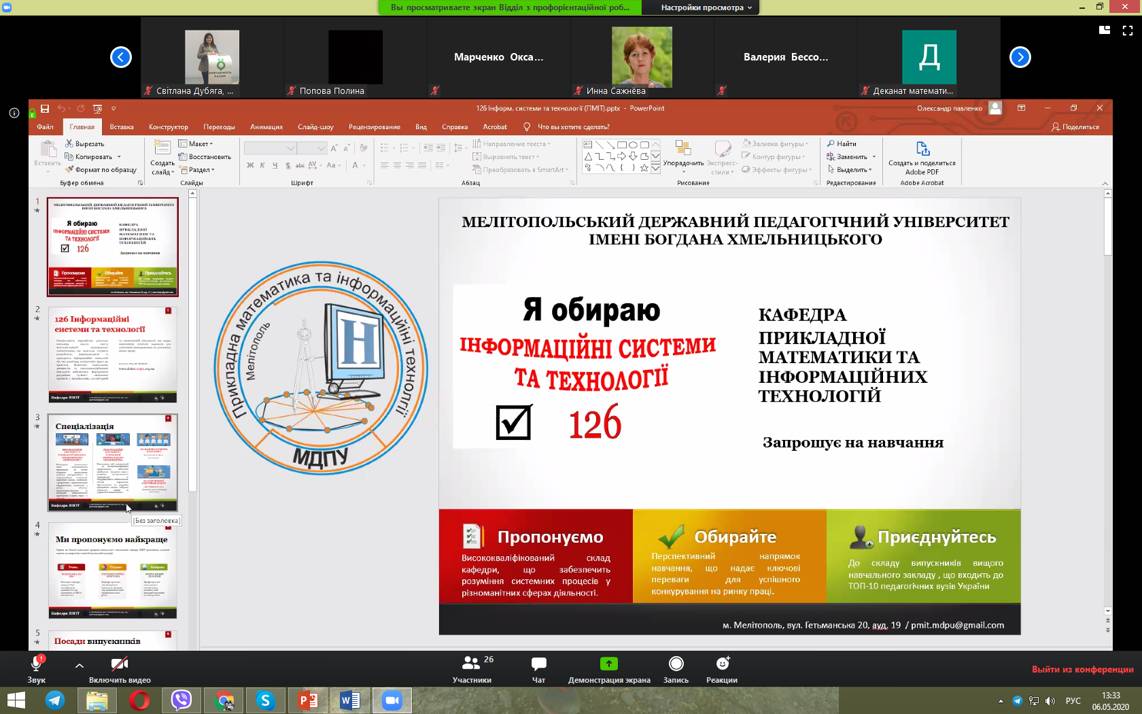 Представники кафедр соціології; інформатики і кібернетики; економіки та готельно-ресторанного бізнесу; математики і фізики; управління та адміністрування; прикладної математики та інформаційних технологій детально ознайомили вступників із спеціальностями та спеціалізаціями факультету. Про студентське життя учасники онлайн-заходу дізналися від куратора з організаційно-виховної роботи Муртазієва Е.Г.