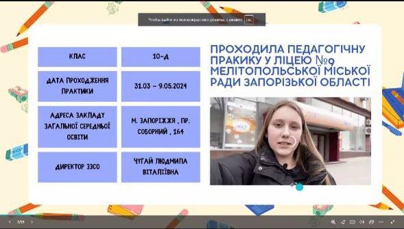 🚀👩🏼🏫Під час проходження практики студенти мали можливість спробувати себе у ролі вчителя, апробувати здобуті теоретичні знання в умовах реального освітнього процесу, розвинути професійні та організаторські навички, а також оцінити власну готовність до педагогічної діяльності.