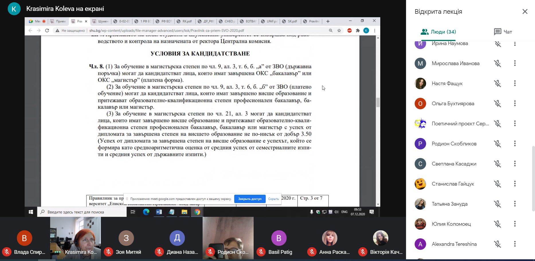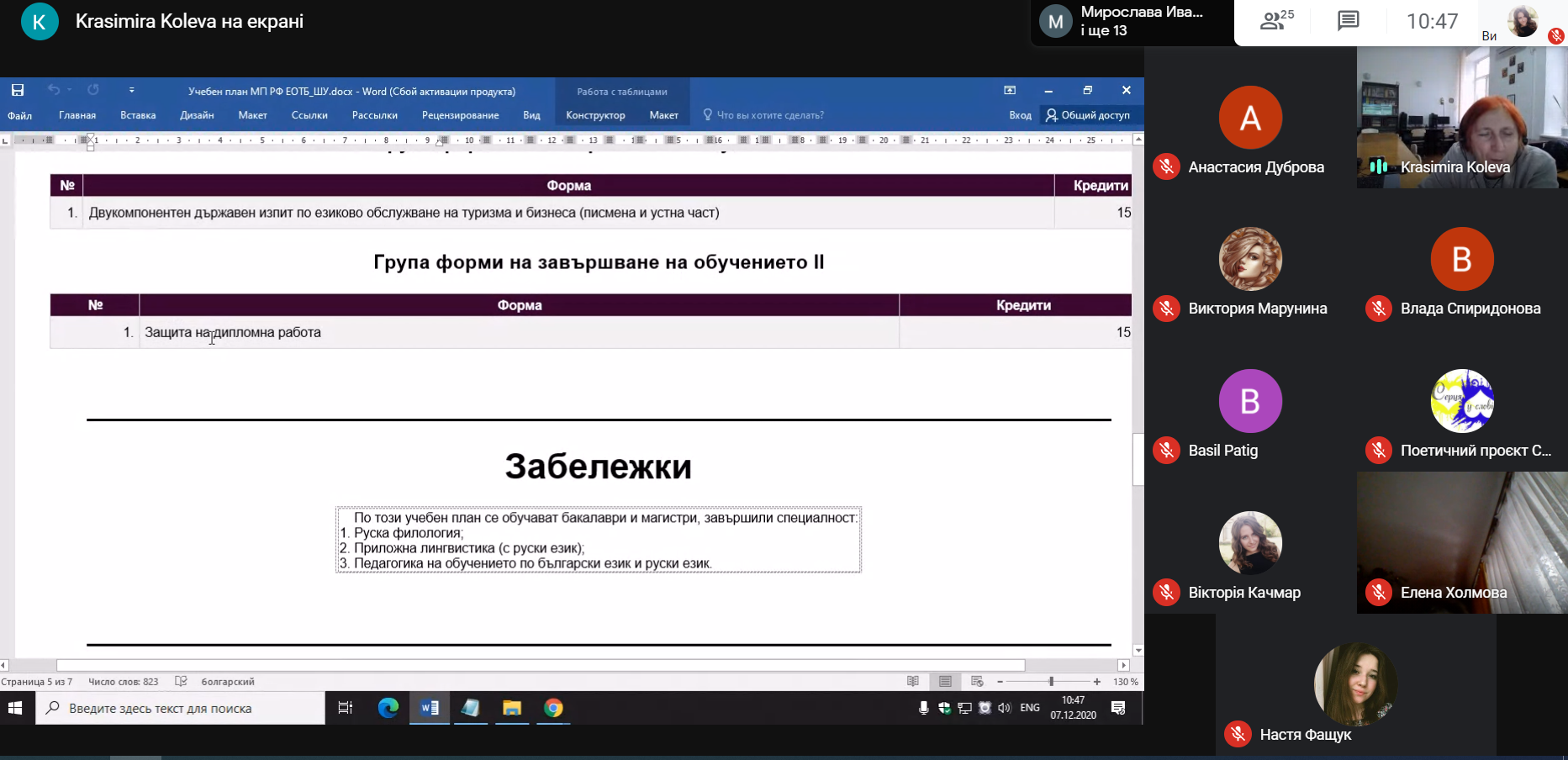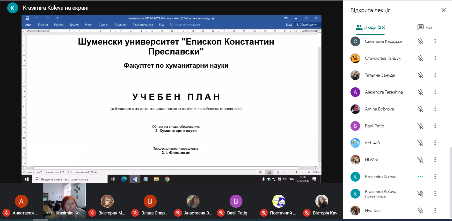 07 грудня 2020 р. на філологічному факультеті відбулася онлайн відкрита лекція Красимири Колевої, доктора наук, лектора болгарської мови, літератури та культури Шуменського університету «Єпископ Костянтин Преславський» (республіка Болгарія) «Филологические магистерские программы в Шуменском университете им. Константина Преславского» для студентів, які навчаються на першому (бакалаврському) та другому (магістерському) рівні за освітніми програмами: Середня освіта. Українська мова і література ; Філологія. Українська мова і література; Середня освіта. Мова і література (англійська, німецька); Філологія. Германські мови та літератури (переклад включно).