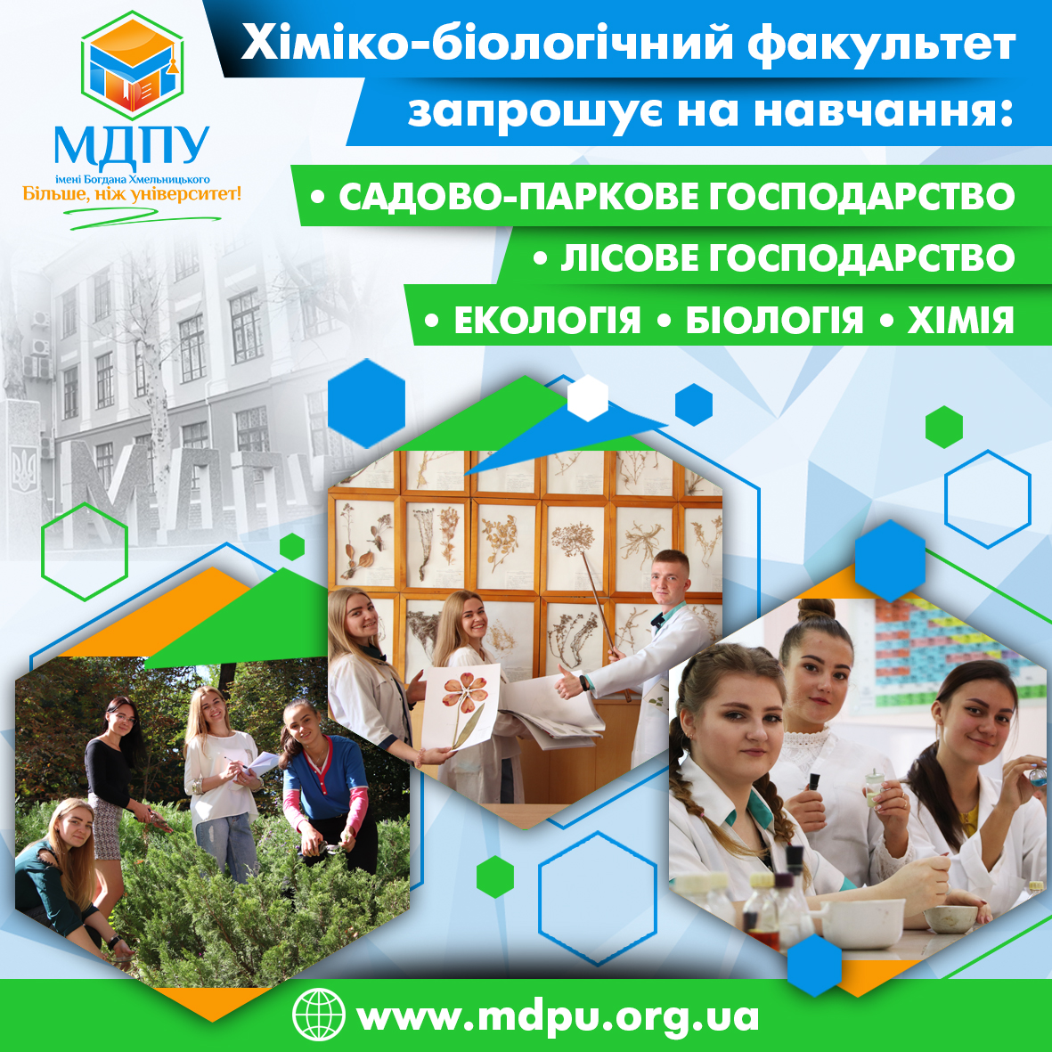 Свої освітні програми і переваги навчальної й наукової діяльності презентували завідувач кафедри неорганічної хімії та хімічної освіти Олександр Максимов, завідувач кафедри анатомії і фізіології людини та тварин Тетяна Станішевська, завідувач кафедри екології, загальної біології та раціонального природокористування Володимир Воровка, доцент кафедри ботаніки і садово-паркового господарства Наталя Туровцева.