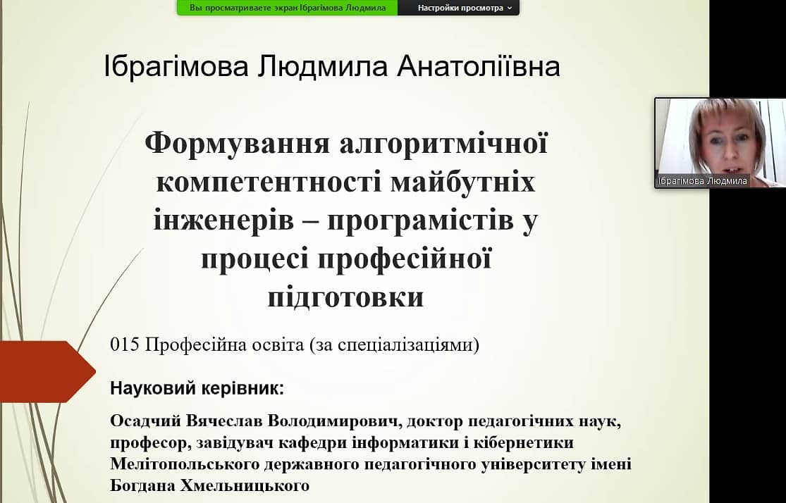 – старшого викладача Ібрагімової Людмили Анатоліївни, тема «Формування алгоритмічної компетентності майбутніх інженерів – програмістів у процесі професійної підготовки»;