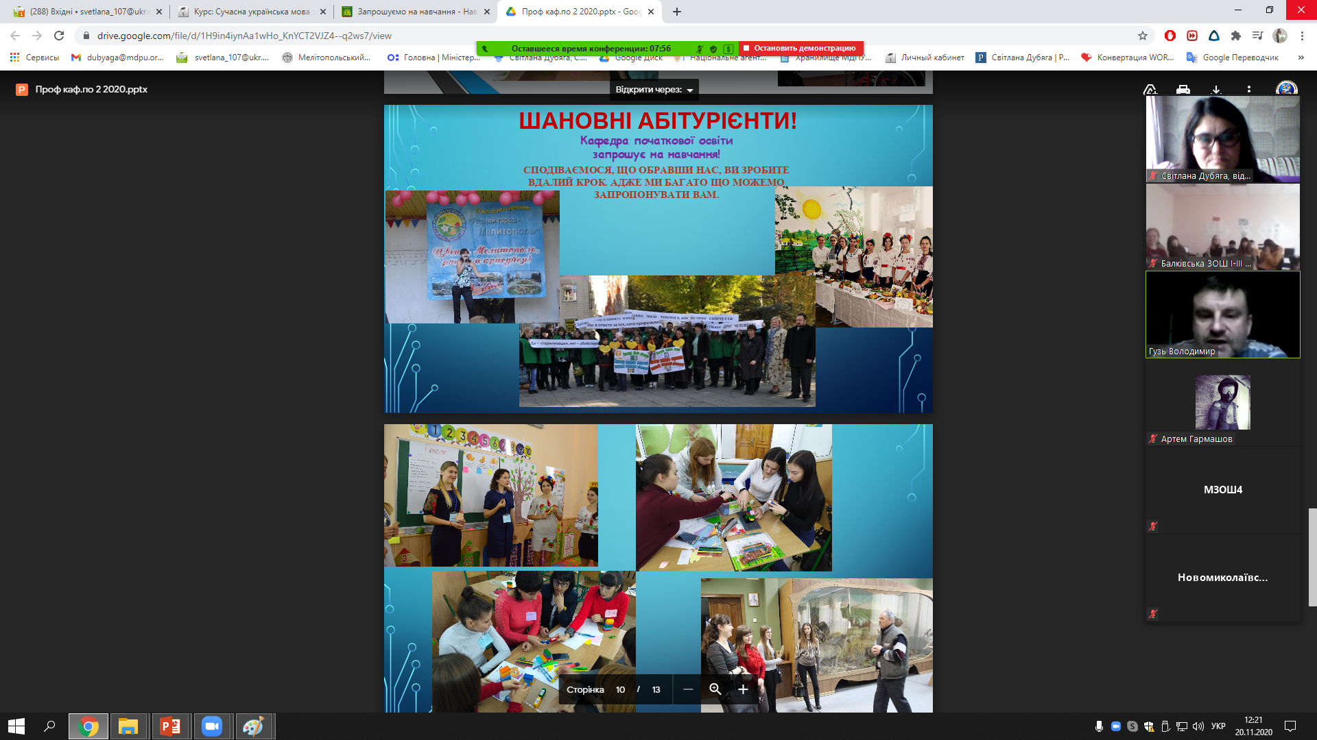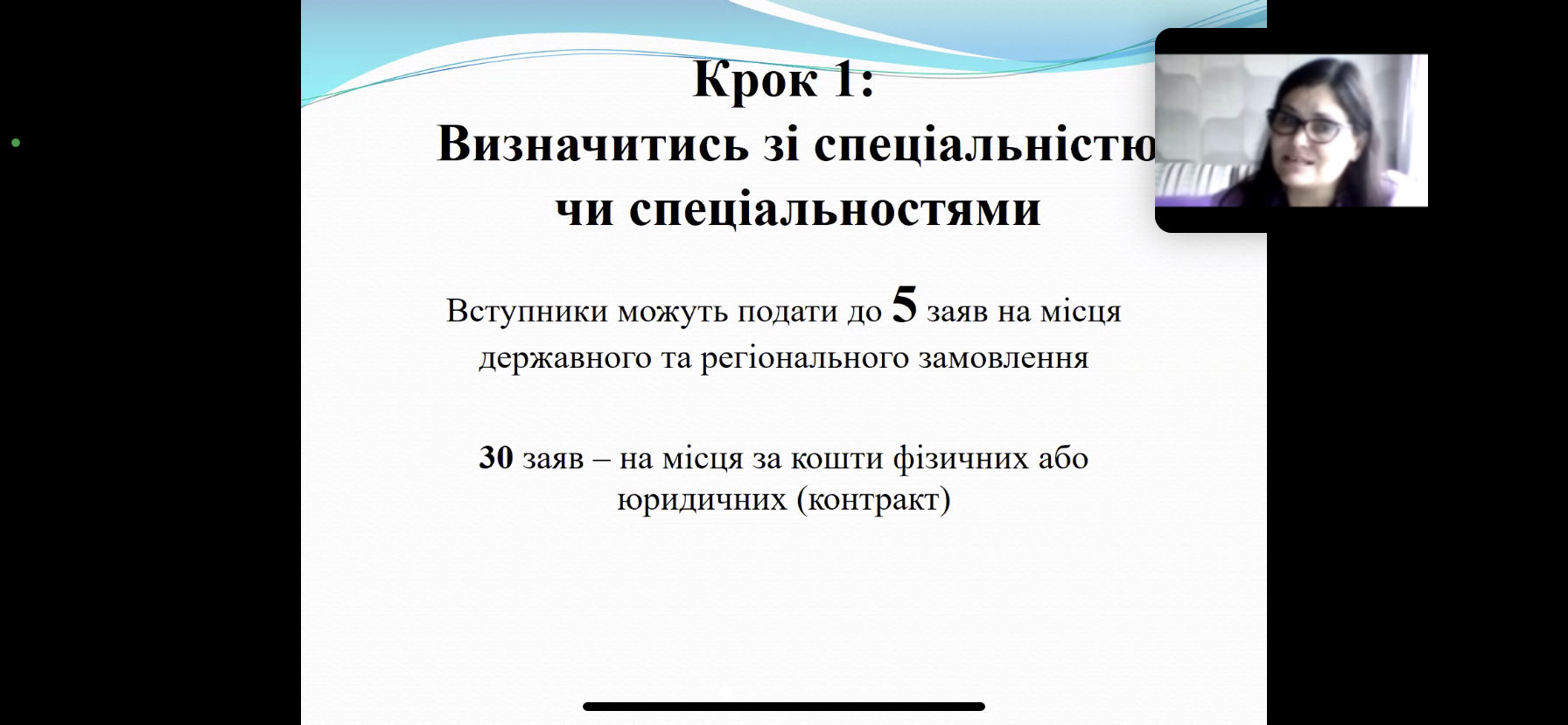 Відкрила захід вітальним словом до майбутніх абітурієнтів завідувачка кафедри, доцент Дубяга Світлана Миколаївна, яка зазначила про особливості та переваги навчання на спеціальності «Початкова освіта», осучасненні підготовки конкурентоспроможних фахівців у галузі початкової освіти. Потім, як відповідальний секретар приймальної комісії, Дубяга С.М. ознайомила абітурієнтів з особливостями прийому до університету у 2021 році, окресливши етапи вступної кампанії, специфіку зарахування вступників тощо. Світлана Миколаївна зазначила, що кожен охочий упродовж вступної кампанії зможе отримати вичерпну інформацію у приймальній комісії університету.