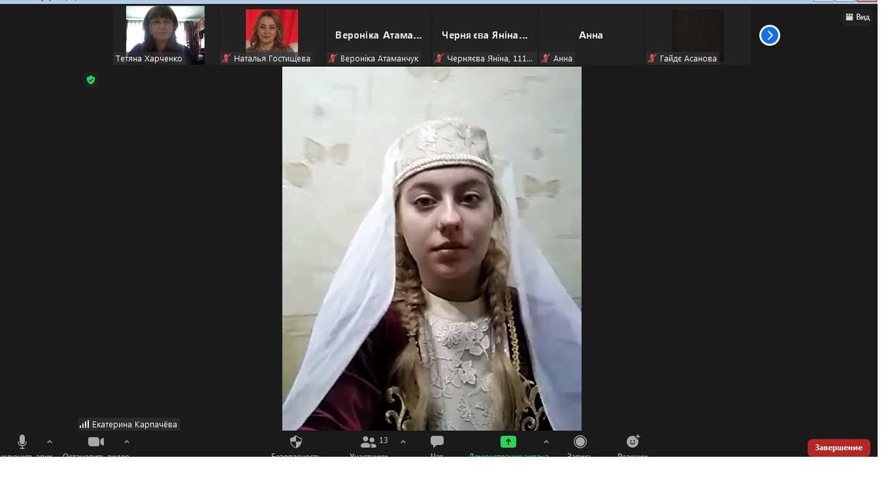 Творчий колектив групи 111/1-ф у складі Черняєвої Яніни, Карпачової Катерини та Голуб Олени презентували до уваги присутніх на заході кримсько-татарську національну кухню. Родзинкою виступу була Карпачова Катерина, одягнена у кримсько-татарський національний костюм, який вона наочно продемонструвала. Незважаючи на он-лайн формат виступу, усі присутні були вражені красою національного одягу кримських татар. Отже, особливості національної кухні є складовою культури народу, і здобувачі вищої освіти філологічного факультету долучилися до інтеркультурного обміну.