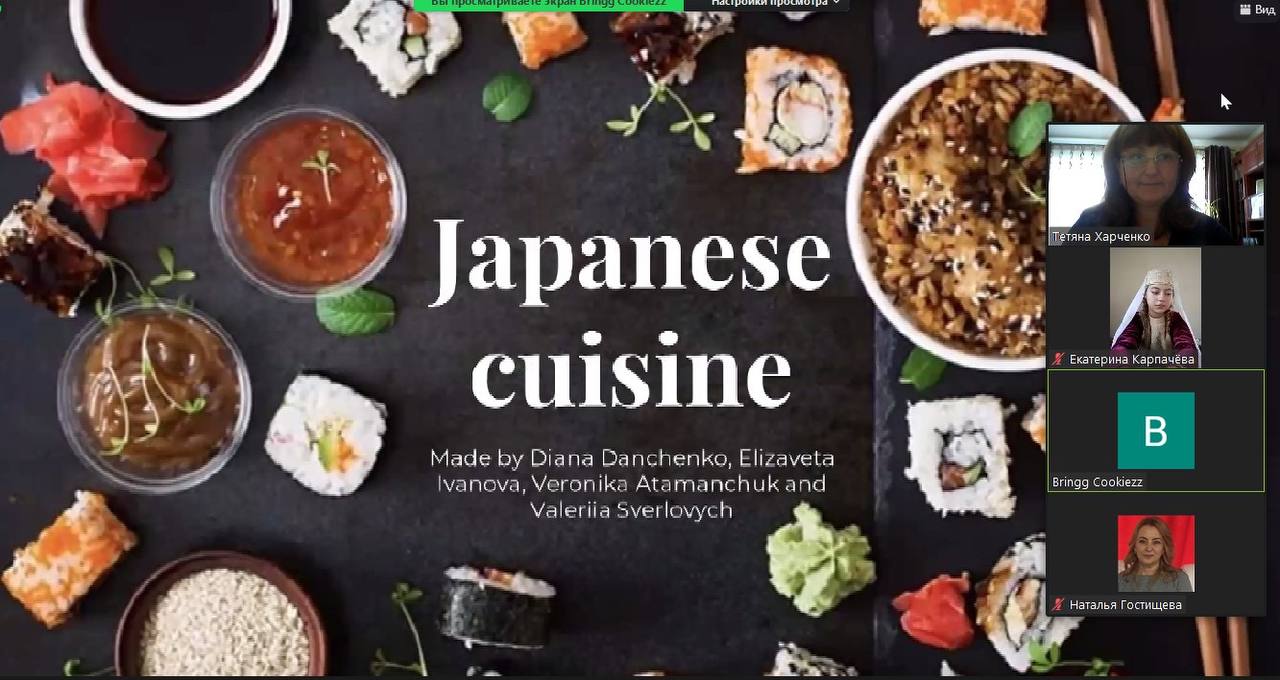 Від групи 411-ф з презентацією про особливості та головні страви африканської кухні виступили Мироєвська Анна та Асанова Гайдє. Сверлович Валерія (група 111/2-ф) представила національні особливості японської кухні, які спільно підготували і оформили в презентацію Атаманчук Вероніка, Данченко Діана, Іванова Єлизавета. Сніжана Купаєва, Маргарита Павлова, Яна Квітко та Зоя Колодіна – здобувачі вищої освіти групи 311-ф – надихнулись італійською національною кухнею і поділилися з присутніми особливостями приготування італійських страв та повідомили цікаві факти про них.