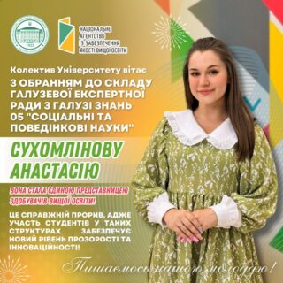 Щиро вітаємо представницю Ради молодих вчених, секретаря Наукового товариства студентів, аспірантів, докторантів та молодих вчених МДПУ імені Богдана Хмельницького Анастасію Сухомлінову з обранням до складу галузевої експертної ради!
