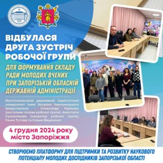 4 грудня 2024 року за ініціативи Департаменту освіти і науки ЗОДА відбулася друга зустріч робочої групи для формування складу Ради молодих вчених при Запорізькій обласній державній адміністрації.