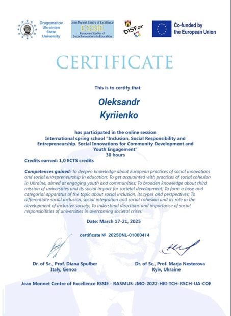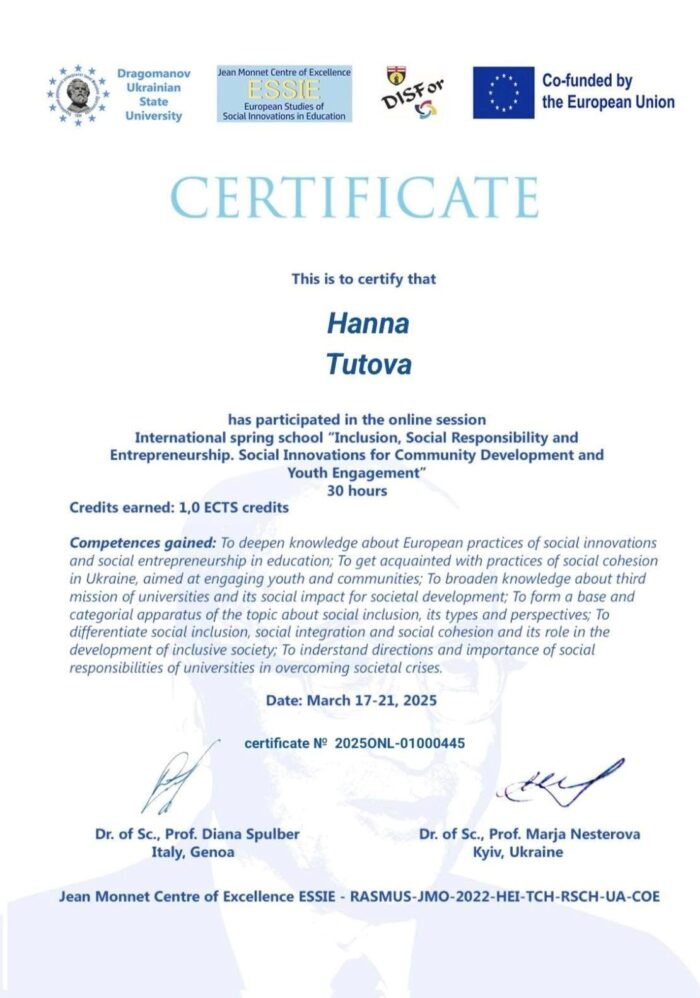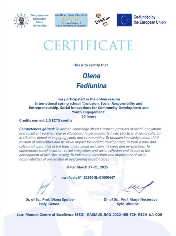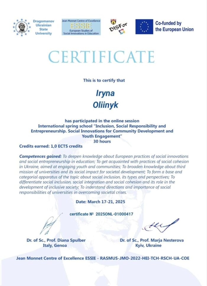 Весняна школа проводилася в рамках імплементації проєкту Центр досконалості Жана Монне «Європейські Студії соціальних інновацій в освіті» – Jean Monnet Centre of Excellence ESSIE – 101085552 – ERASMUS-JMO-2022-COE та у синергії з проєктами напряму Еразмус+ КА2 «Університети-Громади: Посилення співпраці» 10108307 – UNICOM — ERASMUS-EDU-2022-CBHE та Модулю Жана Монне «Практики соціальної та економічної інклюзії в ЄС» – Jean Monnet Module 101127466 – EPSEI – ERASMUS-JMO-2023-HEI-TCH-RSCH.