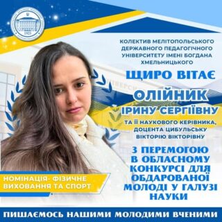 Ірина Олійник, старший викладач кафедри теорії та методики фізичного виховання, секретар Ради молодих вчених МДПУ імені Богдана Хмельницького ;