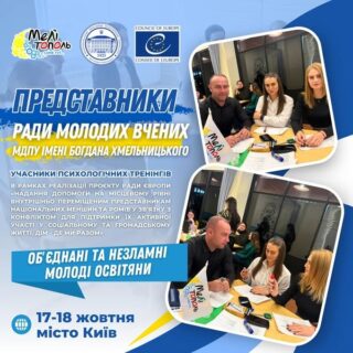 Мелітопольський державний педагогічний університет імені Богдана Хмельницького представляли – Олександр Кирієнко (заступник голови робочої групи), Анастасія Сухомлінова (секретар робочої групи), Ганна Тутова та Олена Федюніна