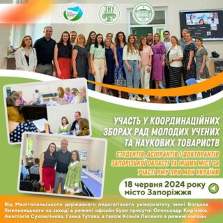 18 червня 2024 року, на базі Запорізького національного університету у змішаному форматі вперше відбулись координаційні збори Рад молодих учених та Наукових товариств студентів, аспірантів і докторантів Запорізької області та інших міст за участі РМУ при МОН України.