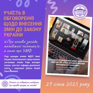 29 січня 2025 року Заступниця голови Ради молодих вчених, асистент кафедри дошкільної освіти і соціальної роботи Негрій Ольга Іванівна доєдналася до Обговорення щодо внесення змін до ЗУ «Про основні засади молодіжної політики», а саме про УМФ .