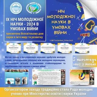 8 листопада 2024 року Радою молодих учених при Міністерстві освіти і науки України було проведено науково-популярний захід для молодих учених України «НІЧ МОЛОДІЖНОЇ НАУКИ-2024 В УМОВАХ ВІЙНИ».