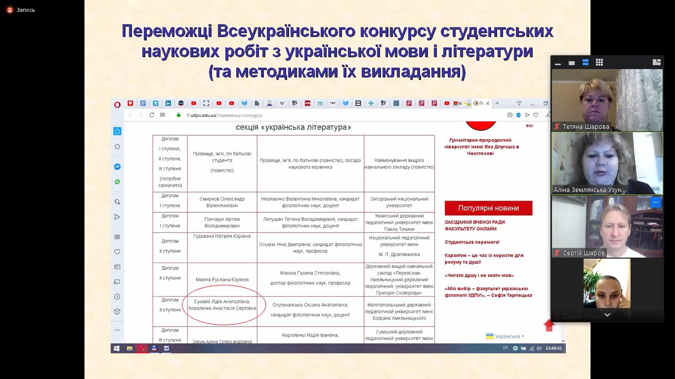 Завідувач кафедри української і зарубіжної літератури, доцент Шарова Т.М. привітала всіх учасників засідання із плідними результатами наукової роботи, подякувала старості гуртка, випускниці магістратури Кузьменко В. за її працю, значні досягнення та привітала нову голову студентського наукового гуртка – студентку ІІ курсу Мельнікову А.