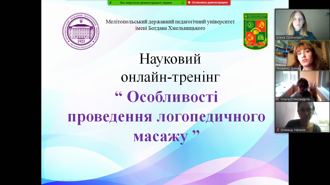 Науковий онлайн-тренінг «Особливості проведення логопедичного масажу»23-24 травня викладачами кафедри дошкільної освіти і соціальної роботи Яковенко І.О. та Солонською А.А. був проведений науковий онлайн-тренінг «Особливості проведення логопедичного масажу».