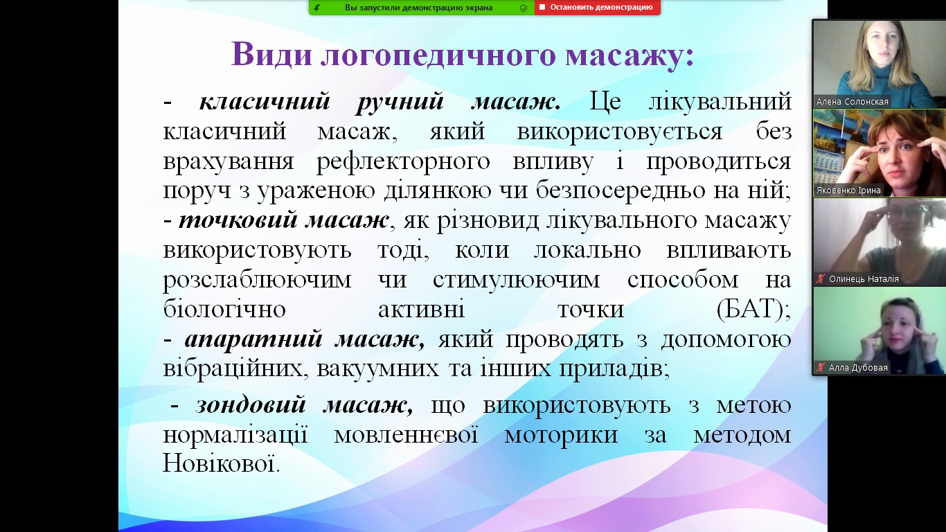 Під час тренінгу учасники дізналися особливості проведення логопедичного масажу, ознайомилися з гігієнічними нормами, вимогами щодо підготовки до логопедичного масажу та його тривалістю, основними видами масажу, показань до застосування та протипоказань.
