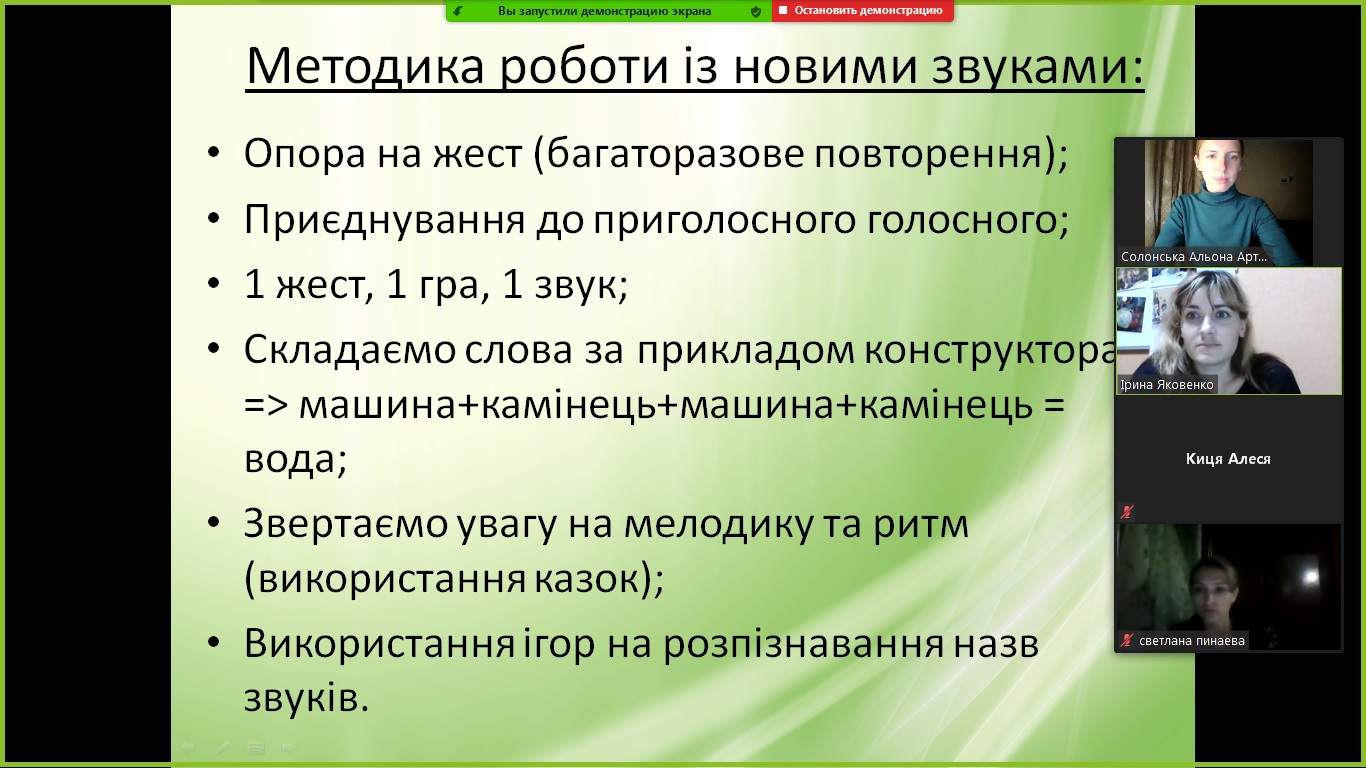 Слухачам було представлено методику запуску мовлення дітей за наслідуванням (через включення дитини до емоційної гри) та механічно (механічна вимова звуків). Також було звернено увагу на запуск мовлення двома варіантами: через голосні або приголосні звуки.
