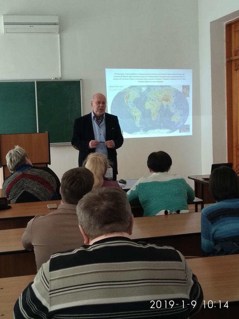 У другій частині доповіді Олег Зуфарович на прикладі застосування творів художньої літератури ознайомив вчителів із методичними аспектами формування в учнів картографічної культури шляхом виконання відповідних завдань.