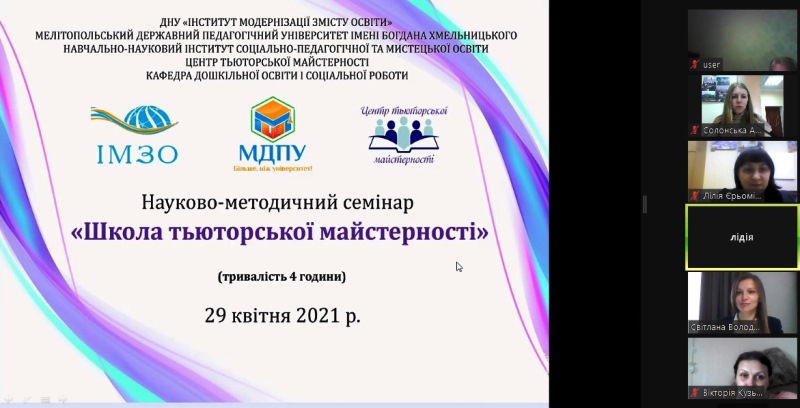 29 квітня 2021 року в рамках Всеукраїнського експерименту впровадження науково-педагогічного проекту «Школа тьюторської майстерності» Мелітопольський державний педагогічний університет імені Богдана Хмельницького у співробітництві з ДНУ «Інститут модернізації змісту освіти» провели науково-методичний семінар «Школа тьюторської майстерності».