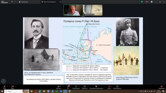 🧭 Лекція була спрямована на виявлення суперечностей і географічних аспектів в історії відкриття Північного полюсу протягом ХІХ–ХХ століть з метою подальшого впровадження компетентнісного підходу у шкільному курсі географії та викладанні фахових дисциплін у закладах вищої освіти. На початку виступу Олег Зуфарович наголосив на важливості вивчення історії географічних відкриттів і символічному значенні Північного полюсу.