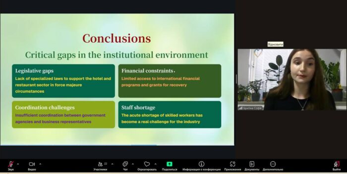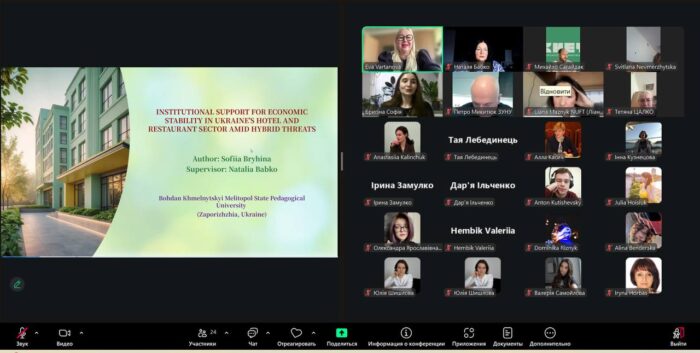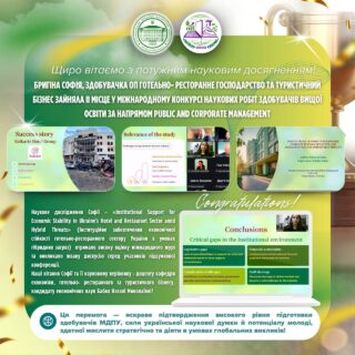 👩🏼🎓📊 Наукове дослідження Софії — «Institutional Support for Economic Stability in Ukraine’s Hotel and Restaurant Sector amid Hybrid Threats» (Інституційне забезпечення економічної стійкості готельно-ресторанного сектору України в умовах гібридних загроз) — отримало високу оцінку міжнародного журі та викликало жваву дискусію серед учасників підсумкової конференції.