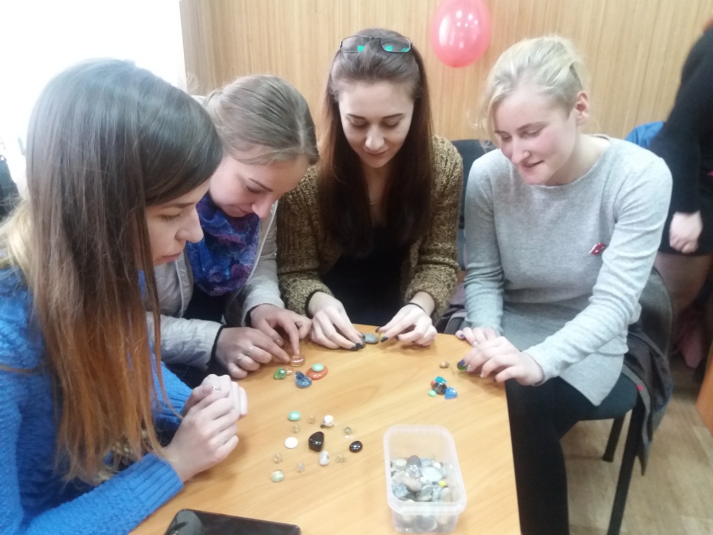 Для роботи були представлені камені всіх основних кольорів, різноманітних форм і розмірів, природного і штучного походження. Учасники тренінгу (студенти та викладачі ННІ СПМО) мали змогу замислитися та розширити зону усвідомлення внутрішнього сприйняття взаємодії тіла, розуму й емоцій за допомогою гри в камінці.