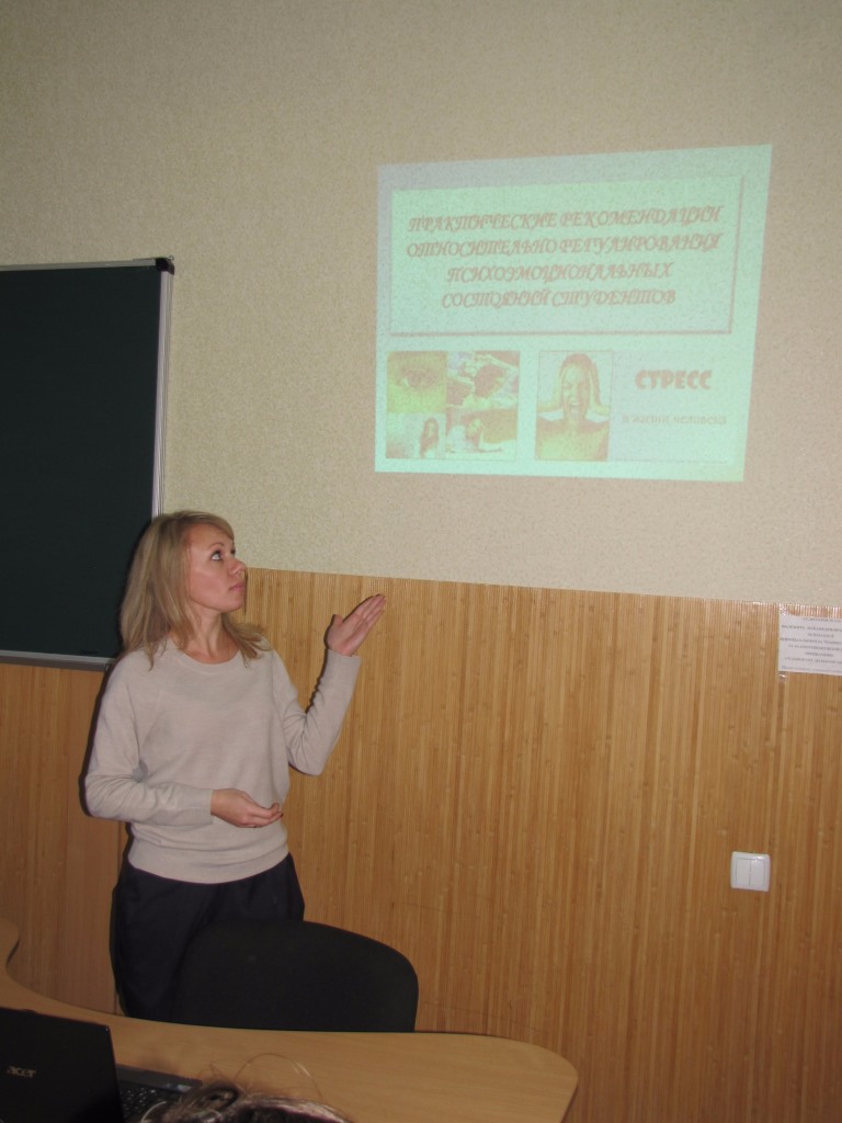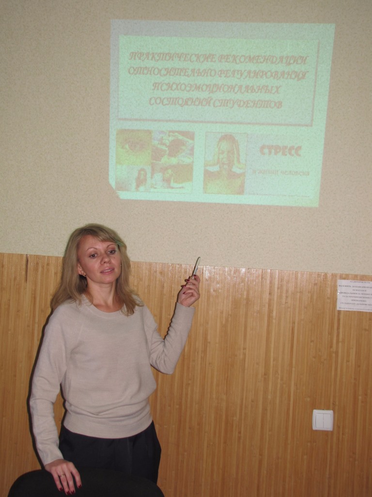 СЕМІНАР У ТЕРИТОРІАЛЬНОМУ ЦЕНТРІ СОЦІАЛЬНОГО ОБСЛУГОВУВАННЯ МЕЛІТОПОЛЬСЬКОЇ МІСЬКОЇ РАДИ ЗАПОРІЗЬКОЇ ОБЛАСТІ На запрошення керівництва Територіального центру соціального обслуговування Мелітопольської міської ради Запорізької області 10 лютого 2016 року співробітниками Психологічного центру МДПУ імені Богдана Хмельницького доц. Прокоф’євою О.О. і доц. Царьковою О.В. було проведено науково-практичний семінар «Особливості комунікації з переселенцями та учасниками АТО». Протягом заходу були розглянуті причини і прояви травматичного стресу, особливості психічних станів та пов’язаних з ними проблем у переселенців та учасників АТО, особливості комунікації з такими громадянами, професійні ризики фахівців допомогаючих професій. Співробітники ТЦСО приймали участь у запропонованих психологічних вправах на розвиток активного слухання і побудови «Я-повідомлення», задавали практичні питання і розповідали актуальні проблеми працівників соціальних служб у спілкуванні з відвідувачами. Наприкінці науково-практичного семінару працівники ТЦСО активно обговорили досвід управління стресом у повсякденній діяльності, а співробітники Психологічного центру надали рекомендації щодо ефективного управління стресом. Матеріал підготувала доц. Прокоф’єва О.О. Інноваційні форми профорієнтаційної робити викладачів кафедри психології. З 24 по 26 листопада у школах міста в межах реалізації проекту "PROFуспіх: стратегія професійного вибору", який відбувається під патронатом Британської ради в Україні, проводилася "Жива бібліотека". Проект спрямований на системне забезпечення процесу професійної орієнтації, що сприятиме усвідомленому вибору профілю навчання в старших класах і призведе, у свою чергу, до усвідомленого і зваженого вибору професії. Семінар «Регулювання психоемоційних станів студентів» Людей расстраивают не события, 28 жовтня 2015 року в межах діяльності Психологічного Центру Мелітопольського державного педагогічного університету імені Богдана Хмельницького та за підтримки Наукового товариства студентів та молодих вчених відбувся семінар «Регулювання психоемоційних станів студентів». На заході були присутні студенти університету, що у 2015-2016 навчальному році приймуть участь у ІІ турі конкурсу Всеукраїнський студентських наукових робіт та Всеукраїнській студентській олімпіаді. На початку семінару к.психол.н., старший викладач кафедри психології Шевченко Світлана Віталіївна наголосила, що поряд з теоретико-методологічною, професійною підготовкою студентів до таких важливих заходів, величезне значення має їх психологічна готовність до протидії й подолання психоемоційного напруження та стресів. Отже, метою семінару було ознайомити студентів із засобами самодіагностики свого психоемоційного стану та зі способами регулювання, подолання негативних проявів психоемоційного напруження та стресу. Під час заходу студенти були ознайомлені з основними видами стресу, факторами виникнення стресу у молодіжному середовищі, їм були презентовані методи розвитку саморегулювання та аутоаналізу у стресових ситуаціях (ведення щоденника стресу та емоційних станів). Виконуючи вправи «Внутрішній промінь», «Мій ворог-мій друг», «Проміні сонця», «Мій настрій», «Ситуація» студенти мали змогу оволодіти способами та отримати на