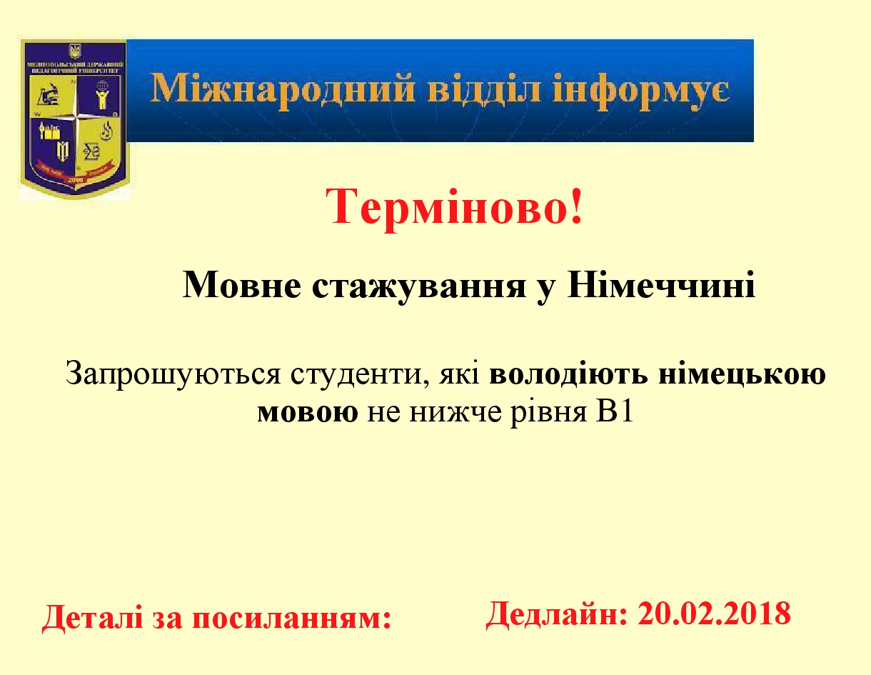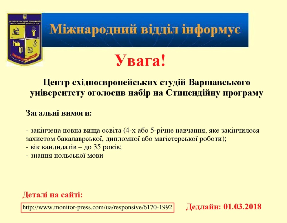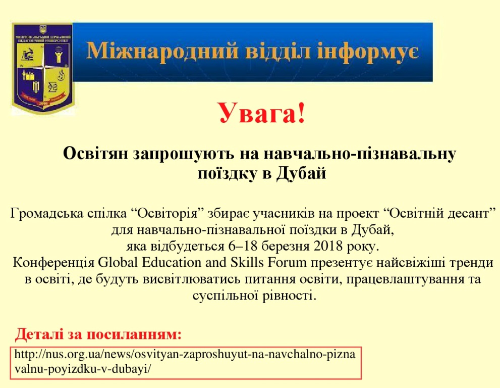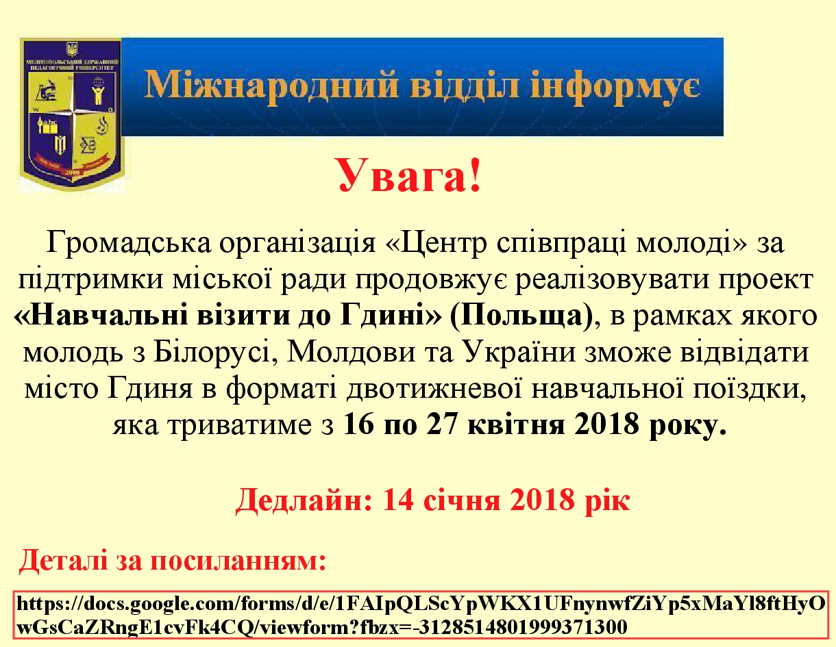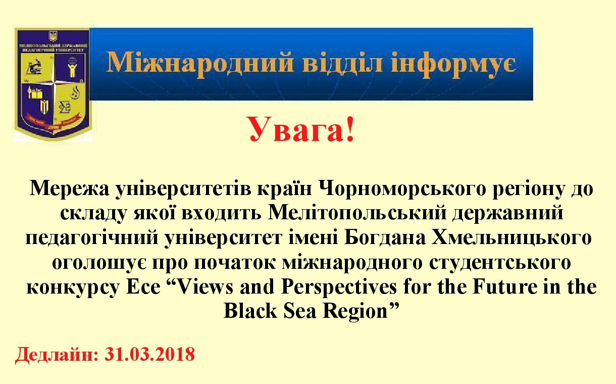 Відділ міжнародних зв’язків університету оголошує конкурс на отримання посади з числа топ-менеджмента в рамках академічного обміну. В рамках реалізації договору про співпрацю з Північно-Казахстанським державним університетом Манаша Козибаєва, науково-педагогічним працівникам МДПУ імені Богдана Хмельницького пропонується посада рівня топ-менеджмента (зав. кафедри, декан, проректор, директор, департаменту, наприклад з стратегії розвитку університету, науки, інноваціям, інтернаціоналізації, якості освіти). Прийом документів відкрито до 17.11.2017. Умови участі у конкурсі: досвід роботи в системі вищої освіти не менше 5 років. В рамках академічного обміну передбачена заробітна плата (приблизно 4000 доларів щомісяця), оплата трансферу в обидва боки 2 рази. Податок з цієї суми сплачується приблизно 20%. Остаточна сума буде уточнена та вказана в договорі. Житло оплачується окремо і не входить в зарплату. Житло підбирає ВНЗ. Сайт університету www.nkzu.kz Для участі у конкурсі необхідно надати наступні документи до відділу міжнародних зв’язків МДПУ: