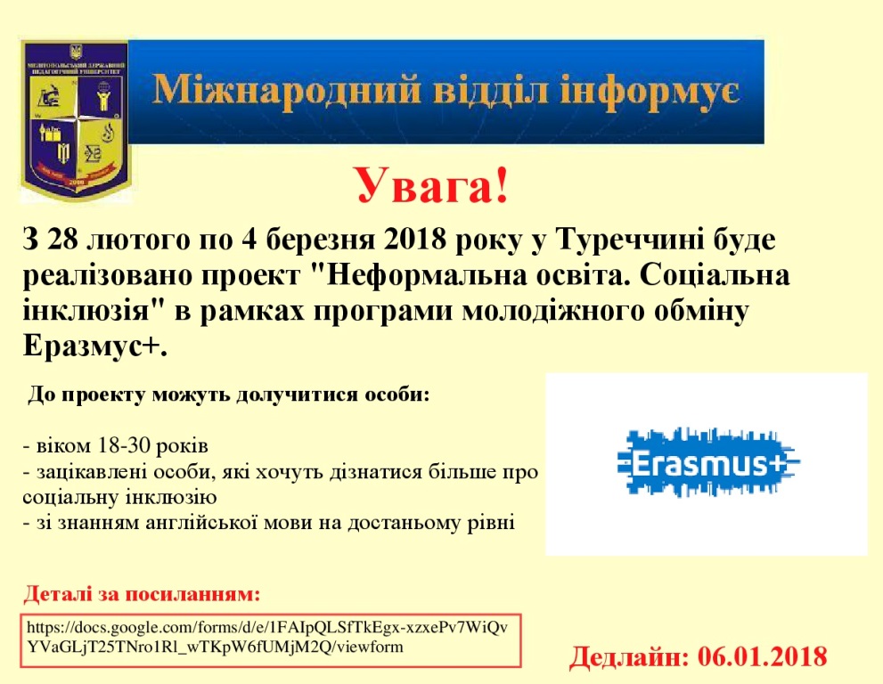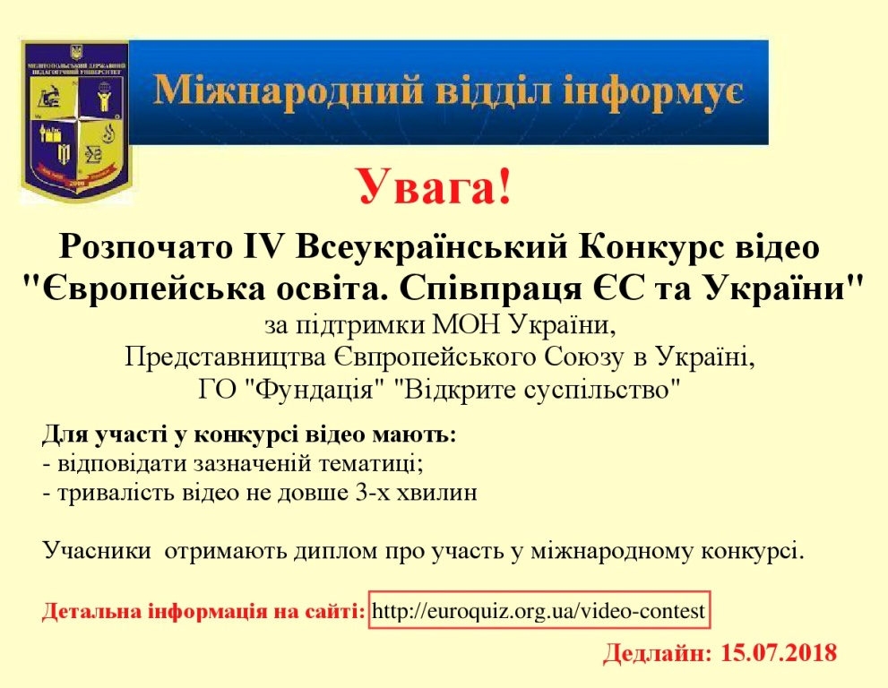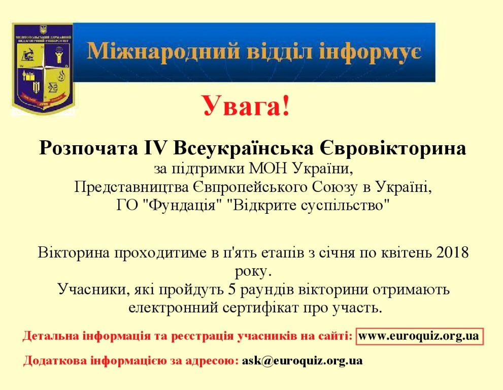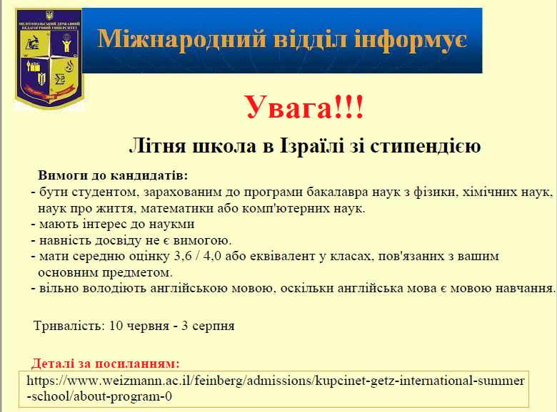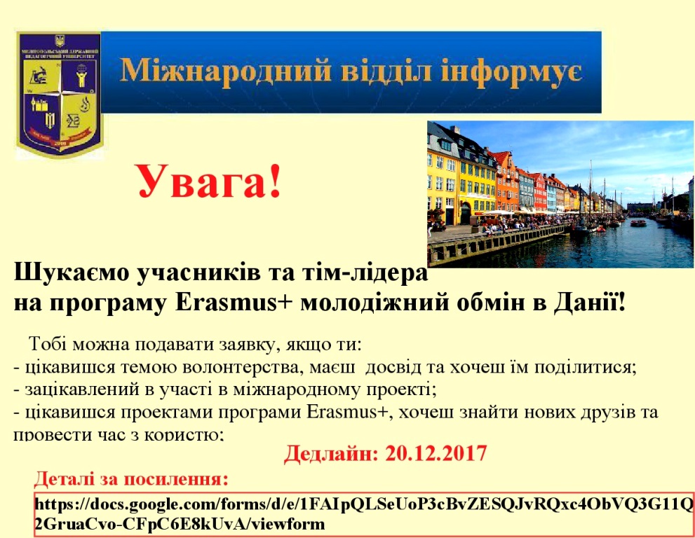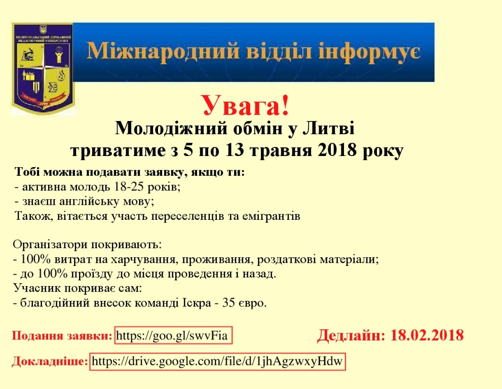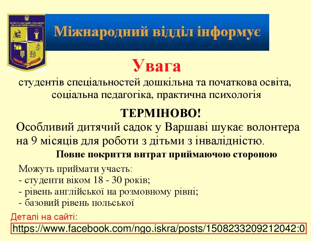 Відділ міжнародних зв’язків університету оголошує конкурс на отримання посади з числа топ-менеджмента в рамках академічного обміну. В рамках реалізації договору про співпрацю з Північно-Казахстанським державним університетом Манаша Козибаєва, науково-педагогічним працівникам МДПУ імені Богдана Хмельницького пропонується посада рівня топ-менеджмента (зав. кафедри, декан, проректор, директор, департаменту, наприклад з стратегії розвитку університету, науки, інноваціям, інтернаціоналізації, якості освіти). Прийом документів відкрито до 17.11.2017. Умови участі у конкурсі: досвід роботи в системі вищої освіти не менше 5 років. В рамках академічного обміну передбачена заробітна плата (приблизно 4000 доларів щомісяця), оплата трансферу в обидва боки 2 рази. Податок з цієї суми сплачується приблизно 20%. Остаточна сума буде уточнена та вказана в договорі. Житло оплачується окремо і не входить в зарплату. Житло підбирає ВНЗ. Сайт університету www.nkzu.kz Для участі у конкурсі необхідно надати наступні документи до відділу міжнародних зв’язків МДПУ: