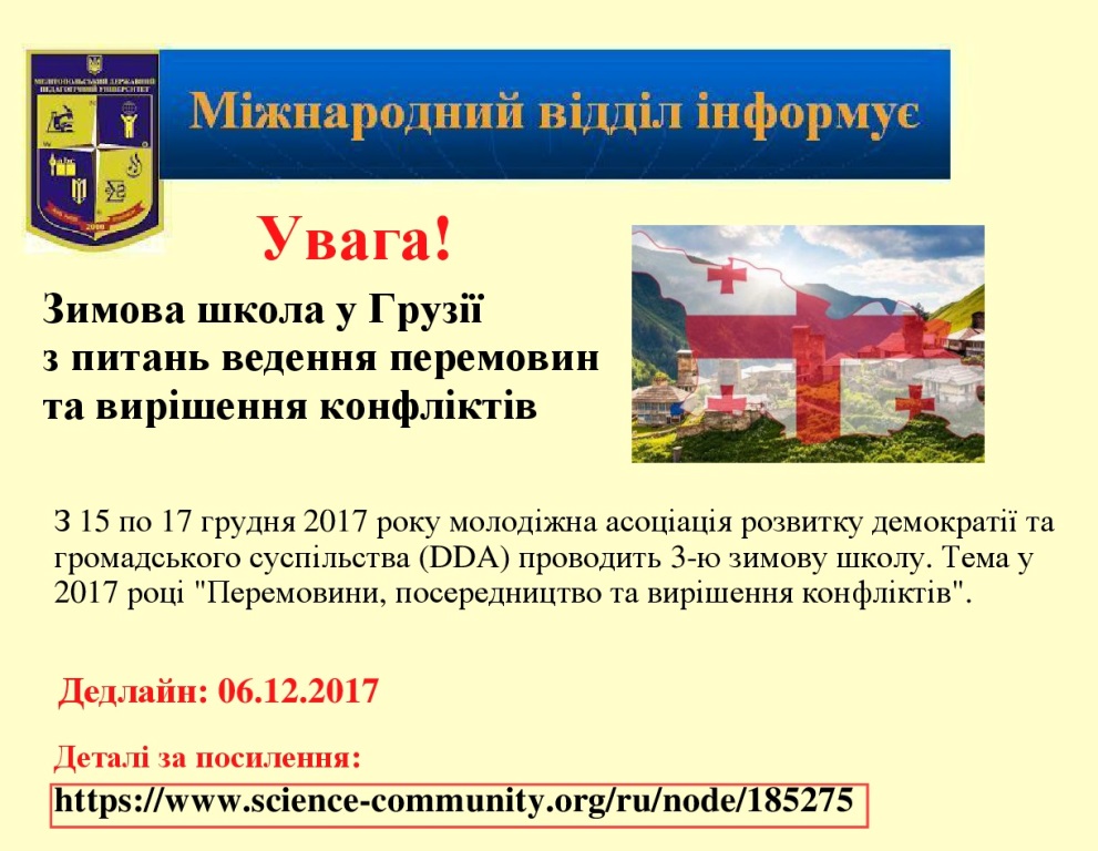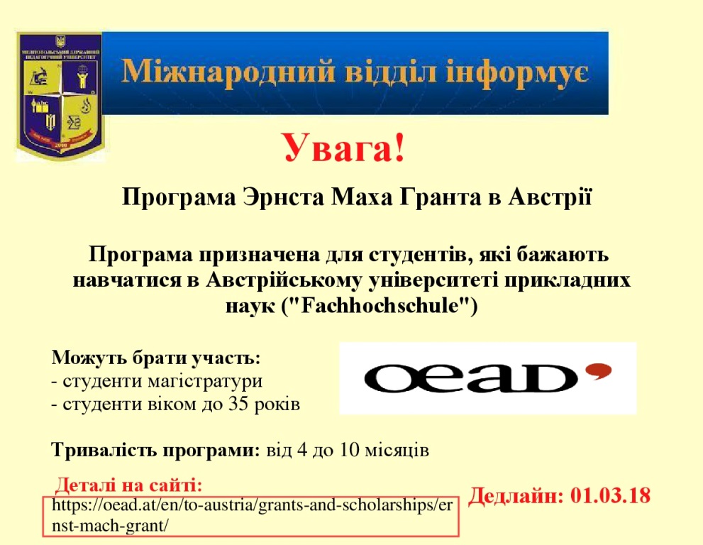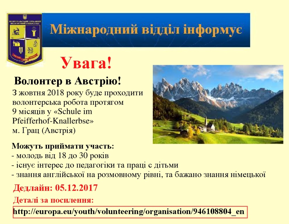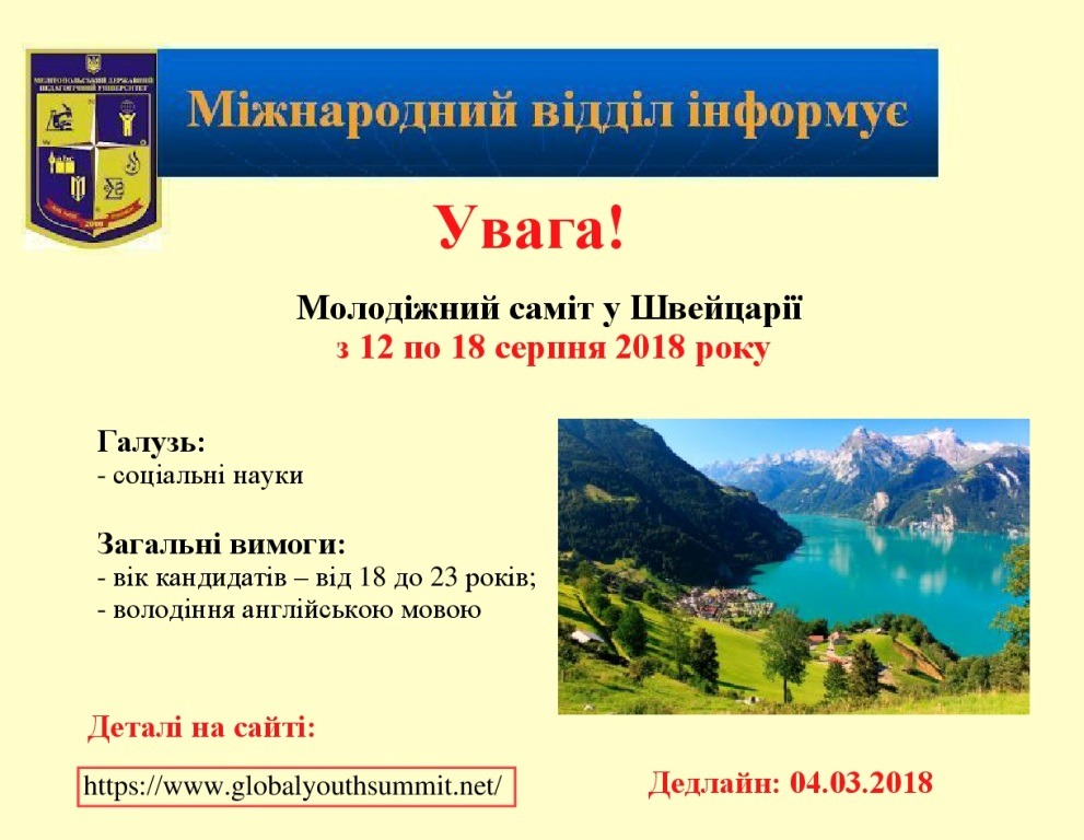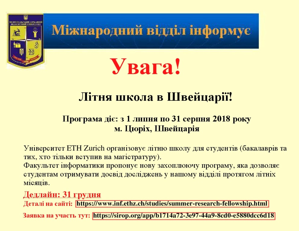 Уряд Швейцарії, через Федеральну комісію стипендій для іноземних студентів, виділив стипендії для іноземних громадян (Research scholarships, PHD scholarships, Postdoctoral Scholarships). Заявки подаються до Посольства Швейцарії в Києві до 5 грудня 2017 року.