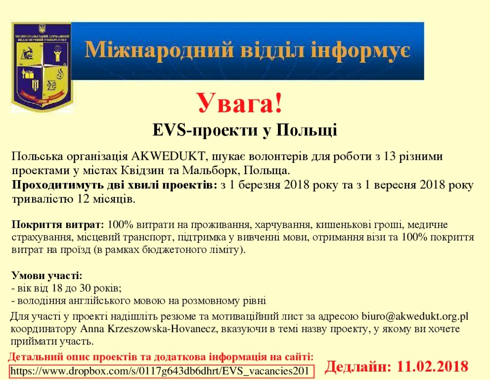 Волонтер в Польшу - дедлайн 3 декабря! Организация "Foundation of Social Changes "Creative" в Гдыне, Польша, ищет волонтера на 12 месяцев для работы с детьми, молодежью и взрослыми. Принимающая организация организовывает мероприятия для людей из локального сообщества, подверженных социальному отчуждению. В рамках проекта, волонтер будет заниматься наблюдением, поддержкой существующих, а также реализацией новых проектов. В обязанности волонтера входит: - проведение уличных игр; Подробнее о проекте можно узнать по ссылке: http://cwm.org.pl/wolontariat-miedzynarodowy/532/2 Где? Gdynia, Poland Когда? 1 февраля 2018 - 31 января 2019 О проекте от организаторов: The activities of the volunteer will mainly take place in one of our active citizens’ centre called “Apteka” in Gdynia. It is important for us to implement actions that would be a true response to needs of local community. We always adjust our activities to the current reality which transforms very fast. Кто может участвовать? Что получает волонтер? Как податься? Желаем удачи!