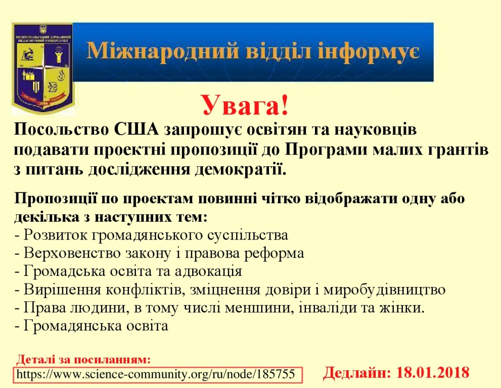 Загальний конкурс проектів Фонду сприяння демократії (ДОКЛАДНІШЕ) ПРОГРАММА RITA – «ПРЕОБРАЗОВАНИЯ В РЕГИОНЕ» (ДОКЛАДНІШЕ) Програма Розвитку міст (ДОКЛАДНІШЕ) DAAD - Німецька служба академічних обмінів (ДОКЛАДНІШЕ)
